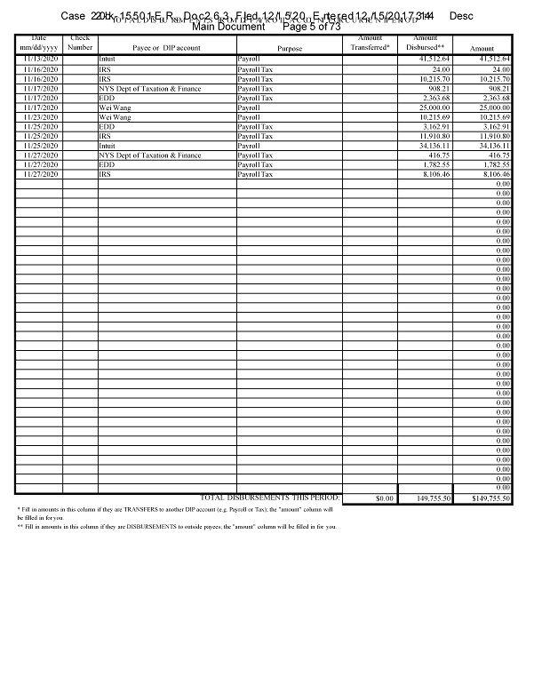 * Fill in amounts in this column if they are TRANSFERS to another DIP account (e.g. Payroll or Tax); the "amount" column will be filled in for you. ** Fill in amounts in this column if they are DISBURSEMENTS to outside payees; the "amount" column will be filled in for you. Date mm/dd/yyyy Check Number Payee or DIP account Purpose Amount Transferred* Amount Disbursed** Amount 11 / 13 / 202 0 Intuit Payroll 41 , 512 . 6 4 41 , 512 . 6 4 11 / 16 / 202 0 IRS Payroll Tax 24 . 0 0 24 . 0 0 11 / 16 / 202 0 IRS Payroll Tax 10 , 215 . 7 0 10 , 215 . 7 0 11 / 17 / 202 0 NYS Dept of Taxation & Finance Payroll Tax 908 . 2 1 908 . 2 1 11 / 17 / 202 0 EDD Payroll Tax 2 , 363 . 6 8 2 , 363 . 6 8 11 / 17 / 202 0 Wei Wang Payroll 25 , 000 . 0 0 25 , 000 . 0 0 11 / 23 / 202 0 Wei Wang Payroll 10 , 215 . 6 9 10 , 215 . 6 9 11 / 25 / 202 0 EDD Payroll Tax 3 , 162 . 9 1 3 , 162 . 9 1 11 / 25 / 202 0 IRS Payroll Tax 11 , 910 . 8 0 11 , 910 . 8 0 11 / 25 / 202 0 Intuit Payroll 34 , 136 . 1 1 34 , 136 . 1 1 11 / 27 / 202 0 NYS Dept of Taxation & Finance Payroll Tax 416 . 7 5 416 . 7 5 11 / 27 / 202 0 EDD Payroll Tax 1 , 782 . 5 5 1 , 782 . 5 5 11 / 27 / 202 0 IRS Payroll Tax 8 , 106 . 4 6 8 , 106 . 4 6 0 . 0 0 0 . 0 0 0 . 0 0 0 . 0 0 0 . 0 0 0 . 0 0 0 . 0 0 0 . 0 0 0 . 0 0 0 . 0 0 0 . 0 0 0 . 0 0 0 . 0 0 0 . 0 0 0 . 0 0 0 . 0 0 0 . 0 0 0 . 0 0 0 . 0 0 0 . 0 0 0 . 0 0 0 . 0 0 0 . 0 0 0 . 0 0 0 . 0 0 0 . 0 0 0 . 0 0 0 . 0 0 0 . 0 0 0 . 0 0 0 . 0 0 0 . 0 0 0 . 0 0 TOTAL DISBURSEMENTS THIS PERIOD: $0.00 149 , 755 . 5 0 $149 , 755 . 5 0 Case 2:20 - bk T - O 1 T 5 A 5 L 0 D 1 I - S E BU R RSEM D E o N c T 2 S 6 FR 3 OM F DI il P e P d AY 1 R 2 O /1 LL 5/ A 2 C 0 COU E NT nt F e O r R e C d U 1 R 2 RE /1 N 5 T / P 2 E 0 RI 1 O 7 D :31:44 Desc Main Document Page 5 of 73