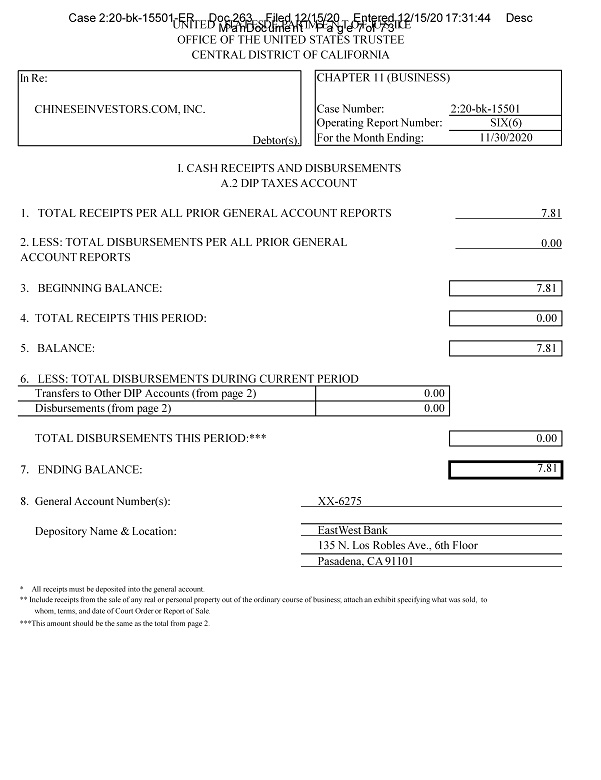 In Re: CHINESEINVESTORS.COM, INC. D e bto r( s ) . 8. General Account Number(s): XX - 6275 Depository Name & Location: EastWest Bank 135 N. Los Robles Ave., 6th Floor Pasadena, CA 91101 * All receipts must be deposited into the general account. ** Include receipts from the sale of any real or personal property out of the ordinary course of business; attach an exhibit specifying what was sold, to whom, terms, and date of Court Order or Report of Sale. ***This amount should be the same as the total from page 2. I. CASH RECEIPTS AND DISBURSEMENTS A.2 DIP TAXES ACCOUNT CHAPTER 11 (BUSINESS) Case Number: 2:20 - bk - 15501 Operating Report Number: For the Month Ending: SIX(6) 11/30/2020 1. TOTAL RECEIPTS PER ALL PRIOR GENERAL ACCOUNT REPORTS 7.81 2. LESS: TOTAL DISBURSEMENTS PER ALL PRIOR GENERAL ACCOUNT REPORTS 0.00 3. BEGINNING BALANCE: 7.81 4. TOTAL RECEIPTS THIS PERIOD: 0.00 5. BALANCE: 7.81 6. LESS: TOTAL DISBURSEMENTS DURING CURRENT PERIOD Transfers to Other DIP Accounts (from page 2) 0.00 Disbursements (from page 2) 0.00 TOTAL DISBURSEMENTS THIS PERIOD:*** 0.00 7. ENDING BALANCE: 7.81 Case 2:20 - bk - 15501 - ER Doc 263 Filed 12/15/20 Entered 12/15/20 17:31:44 Desc UNITED M ST a A in T D E o S c D u E m P e A n R t TM P E a N g T e O 7 F o J f U 7 S 3 TICE OFFICE OF THE UNITED STATES TRUSTEE CENTRAL DISTRICT OF CALIFORNIA