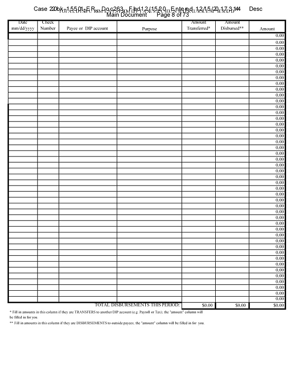 * Fill in amounts in this column if they are TRANSFERS to another DIP account (e.g. Payroll or Tax); the "amount" column will be filled in for you. ** Fill in amounts in this column if they are DISBURSEMENTS to outside payees; the "amount" column will be filled in for you. Date mm/dd/yyyy Check Number Payee or DIP account Purpose Amount Transferred* Amount Disbursed** Amount 0 . 0 0 0 . 0 0 0 . 0 0 0 . 0 0 0 . 0 0 0 . 0 0 0 . 0 0 0 . 0 0 0 . 0 0 0 . 0 0 0 . 0 0 0 . 0 0 0 . 0 0 0 . 0 0 0 . 0 0 0 . 0 0 0 . 0 0 0 . 0 0 0 . 0 0 0 . 0 0 0 . 0 0 0 . 0 0 0 . 0 0 0 . 0 0 0 . 0 0 0 . 0 0 0 . 0 0 0 . 0 0 0 . 0 0 0 . 0 0 0 . 0 0 0 . 0 0 0 . 0 0 0 . 0 0 0 . 0 0 0 . 0 0 0 . 0 0 0 . 0 0 0 . 0 0 0 . 0 0 0 . 0 0 0 . 0 0 0 . 0 0 0 . 0 0 0 . 0 0 0 . 0 0 TOTAL DISBURSEMENTS THIS PERIOD: $0.00 $0.00 $0 . 0 0 Case 2:20 - b T k O - T 1 A 5 L 5 D 0 I 1 S - B E U R RSEM D E o N c T 2 S 6 F 3 ROM F D il I e P d T 1 A 2 X / E 1 S 5 A /2 C 0 COU E N n T t F e O re R d CU 1 R 2 R /1 E 5 N / T 20 PE 1 R 7 IO :3 D 1:44 Desc Main Document Page 8 of 73
