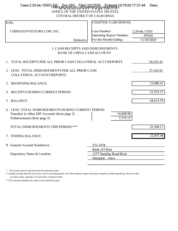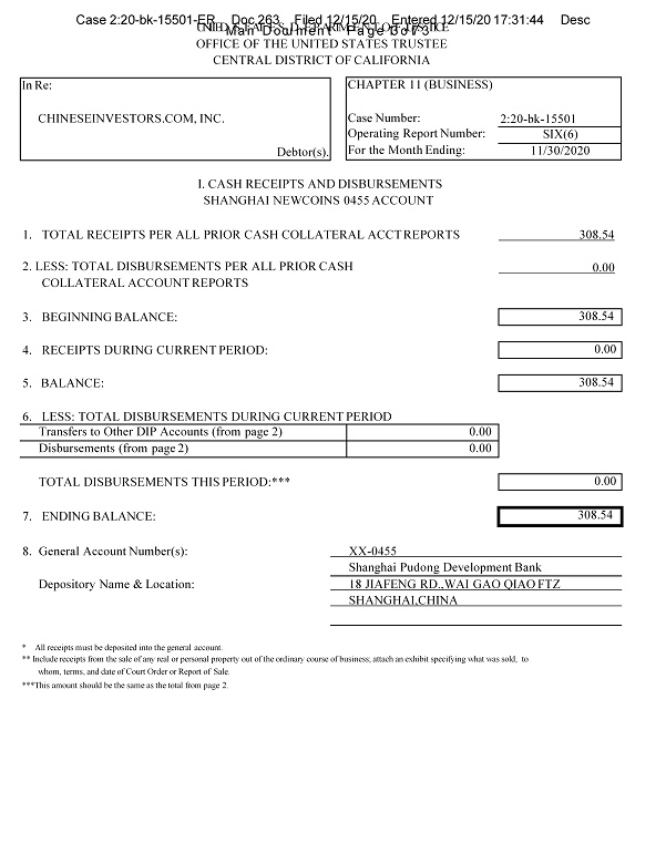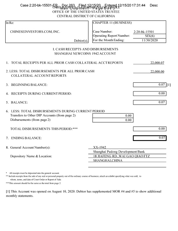 In Re: CHINESEINVESTORS.COM, INC. Debto r( s ). 1. TOTAL RECEIPTS PER ALL PRIOR CASH COLLATERAL ACCT REPORTS 22,000.07 22,000.00 2. LESS: TOTAL DISBURSEMENTS PER ALL PRIOR CASH COLLATERAL ACCOUNT REPORTS 3. BEGINNING BALANCE: 0. 0 7 [1] 4. RECEIPTS DURING CURRENT PERIOD: 0. 0 0 5. BALANCE: 0. 0 7 6. LESS: TOTAL DISBURSEMENTS DURING CURRENT PERIOD 0. 0 0 Transfers to Other DIP Accounts (from page 2) Disbursements (from page 2) 0. 0 0 TOTAL DISBURSEMENTS THIS PERIOD:*** 0. 0 0 0. 0 7 7. ENDING BALANCE: 8. General Account Number(s): XX - 1942 Shanghai Pudong Development Bank Depository Name & Location: 18 JIAFENG RD.,WAI GAO QIAO FTZ SHANGHAI,CHINA * All receipts must be deposited into the general account. ** Include receipts from the sale of any real or personal property out of the ordinary course of business; attach an exhibit specifying what was sold, to whom, terms, and date of Court Order or Report of Sale. ***This amount should be the same as the total from page 2. I. CASH RECEIPTS AND DISBURSEMENTS SHANGHAI NEWCOINS 1942 ACCOUNT [1] This Account was opened on August 10, 2020. Debtor has supplemented MOR #4 and #5 to show additional monthly statements. CHAPTER 11 (BUSINESS) Case Number: Operating Report Number: For the Month Ending: 2:20 - bk - 15501 SIX(6) 11/30/2020 Case 2:20 - bk - 15501 - ER Doc 263 Filed 12/15/20 Entered 12/15/20 17:31:44 Desc UNITED M S a T in AT D E o S cu D m E e P n A t RTM P E a N g T e O 16 F o JU f 7 S 3 TICE OFFICE OF THE UNITED STATES TRUSTEE CENTRAL DISTRICT OF CALIFORNIA