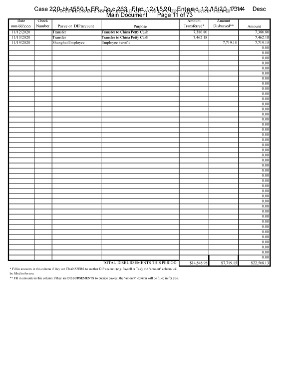 * Fill in amounts in this column if they are TRANSFERS to another DIP account (e.g. Payroll or Tax); the "amount" column will be filled in for you. ** Fill in amounts in this column if they are DISBURSEMENTS to outside payees; the "amount" column will be filled in for you. Date mm/dd/yyyy Check Number Payee or DIP account Purpose Amount Transferred* Amount Disbursed** Amount 11/12/2020 Transfer Transfer to China Petty Cash 7,386.80 7,386.80 11/13/2020 Transfer Transfer to China Petty Cash 7,462.18 7,462.18 11/19/2020 Shanghai Employee Employee benefit 7,719.15 7,719.15 0.00 0.00 0.00 0.00 0.00 0.00 0.00 0.00 0.00 0.00 0.00 0.00 0.00 0.00 0.00 0.00 0.00 0.00 0.00 0.00 0.00 0.00 0.00 0.00 0.00 0.00 0.00 0.00 0.00 0.00 0.00 0.00 0.00 0.00 0.00 0.00 0.00 0.00 0.00 0.00 0.00 0.00 TOTAL DISBURSEMENTS THIS PERIOD: $14,848.98 $7,719.15 $22,568.13 Case 2: T 2 O 0 T - A b L k D - 1 IS 5 B 5 U 0 RS 1 E - M E E R NTS F D R o OM c B 2 A 6 N 3 K OF F C il H e I d NA 1 C 2 A / S 1 H 5 A /2 C 0 COUN E T n F t O e R re C d UR 1 R 2 EN /1 T 5 P / E 2 R 0 IOD 17:31:44 Desc Main Document Page 11 of 73