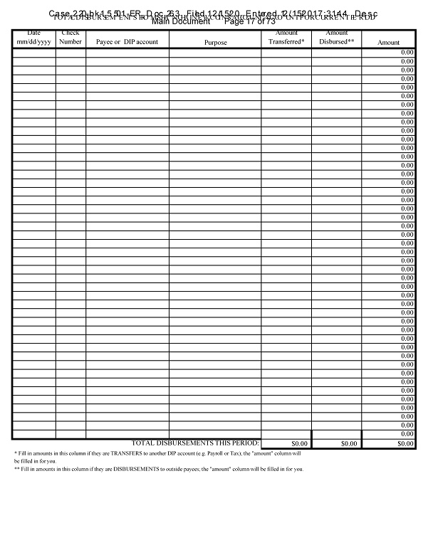 * Fill in amounts in this column if they are TRANSFERS to another DIP account (e.g. Payroll or Tax); the "amount" column will be filled in for you. ** Fill in amounts in this column if they are DISBURSEMENTS to outside payees; the "amount" column will be filled in for you. Date mm/dd/yyyy Check Number Payee or DIP account Purpose Amount Transferred* Amount Disbursed** Amount 0 . 0 0 0 . 0 0 0 . 0 0 0 . 0 0 0 . 0 0 0 . 0 0 0 . 0 0 0 . 0 0 0 . 0 0 0 . 0 0 0 . 0 0 0 . 0 0 0 . 0 0 0 . 0 0 0 . 0 0 0 . 0 0 0 . 0 0 0 . 0 0 0 . 0 0 0 . 0 0 0 . 0 0 0 . 0 0 0 . 0 0 0 . 0 0 0 . 0 0 0 . 0 0 0 . 0 0 0 . 0 0 0 . 0 0 0 . 0 0 0 . 0 0 0 . 0 0 0 . 0 0 0 . 0 0 0 . 0 0 0 . 0 0 0 . 0 0 0 . 0 0 0 . 0 0 0 . 0 0 0 . 0 0 0 . 0 0 0 . 0 0 0 . 0 0 0 . 0 0 TOTAL DISBURSEMENTS THIS PERIOD: $0.00 $0.00 $0 . 0 0 C T a O s T e AL 2: D 2 I 0 S - B b U k R - 1 SE 5 M 50 E 1 N - T E S R FRO D M o S c HA 26 N 3 GHA F I i N le E d W 1 C 2 O / I 1 N 5 S /2 A 0 CCO E U n N t T er A e C d CO 12 U / N 1 T 5 F /2 O 0 R 1 C 7 U : R 3 R 1 E :4 N 4 T PE D R e IO s D c Main Document Page 17 of 73
