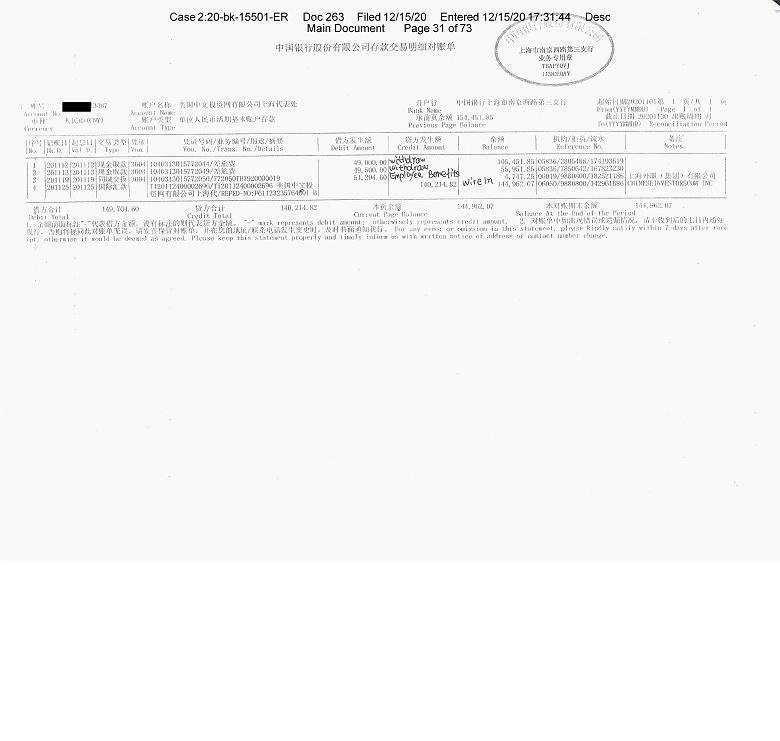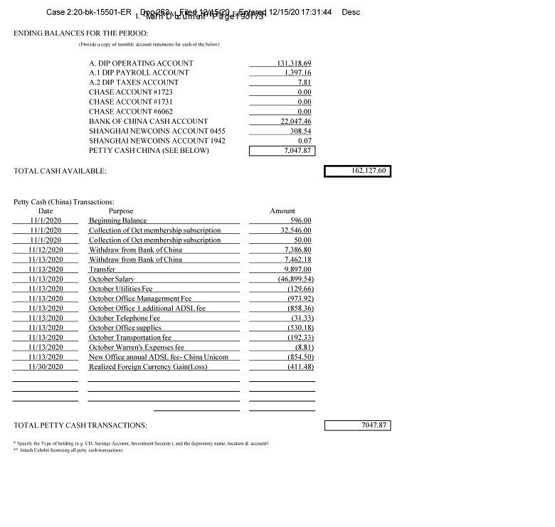 TOTAL PETTY CASH TRANSACTIONS: 7047.87 * Specify the Type of holding (e.g. CD, Savings Account, Investment Security), and the depository name, location & account# ** Attach Exhibit Itemizing all petty cash transactions A. DIP OPERATING ACCOUNT 131,318.69 A.1 DIP PAYROLL ACCOUNT 1,397.16 A.2 DIP TAXES ACCOUNT 7.81 CHASE ACCOUNT #1723 0.00 CHASE ACCOUNT #1731 0.00 CHASE ACCOUNT #6062 0.00 BANK OF CHINA CASH ACCOUNT 22,047.46 SHANGHAI NEWCOINS ACCOUNT 0455 308.54 SHANGHAI NEWCOINS ACCOUNT 1942 0.07 PETTY CASH CHINA (SEE BELOW) 7,047.87 TOTAL CASH AVAILABLE: 162,127.60 Petty Cash (China) Transactions: Date Purpose Amount 11/1/2020 Beginning Balance 596.00 11/1/2020 Collection of Oct membership subscription 32,546.00 11/1/2020 Collection of Oct membership subscription 50.00 11/12/2020 Withdraw from Bank of China 7,386.80 11/13/2020 Withdraw from Bank of China 7,462.18 11/13/2020 Transfer 9,897.00 11/13/2020 October Salary (46,899.54) 11/13/2020 October Utilities Fee (129.66) 11/13/2020 October Office Managerment Fee (973.92) 11/13/2020 October Office 1 additional ADSL fee (858.36) 11/13/2020 October Telephone Fee (31.33) 11/13/2020 October Office supplies (530.18) 11/13/2020 October Transportation fee (192.33) 11/13/2020 October Warren's Expenses fee (8.81) 11/13/2020 New Office annual ADSL fee - China Unicom (854.50) 11/30/2020 Realized Foreign Currency Gain(Loss) (411.48) Case 2:20 - bk - 15501 - ER I. Doc 263 Filed 12/15/20 Entered 12/15/20 17:31:44 Desc D M . a S i U n M D M oc A u R m Y en S t CHE P D a U g L e E 1 O 9 F o C f A 7 S 3 H ENDING BALANCES FOR THE PERIOD: (Provide a copy of monthly account statements for each of the below)