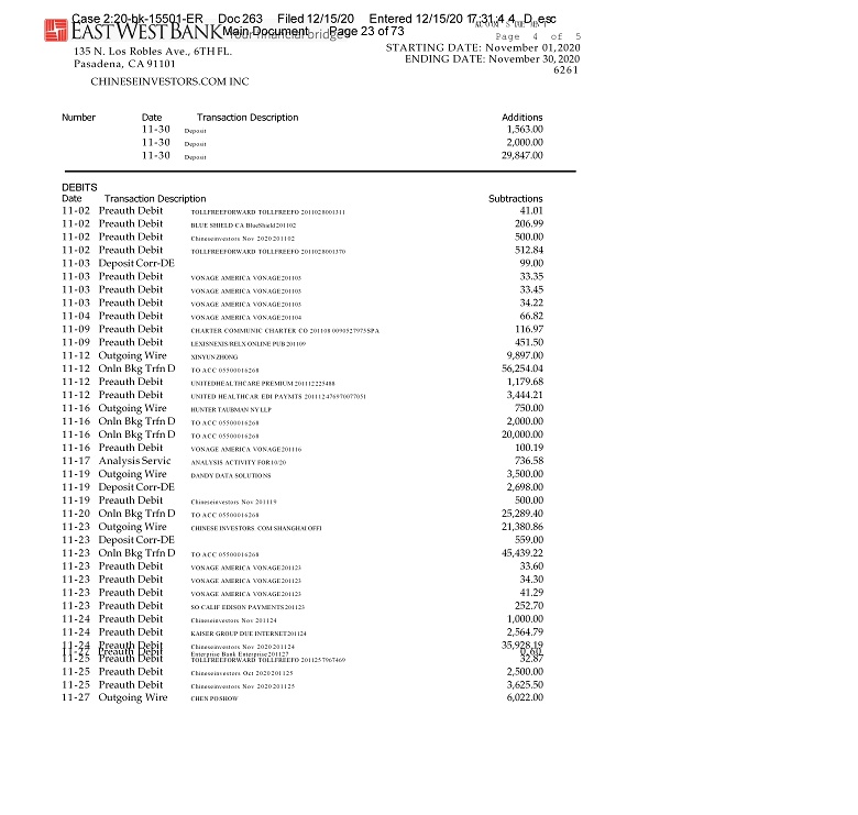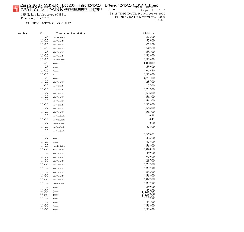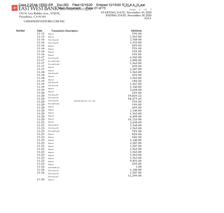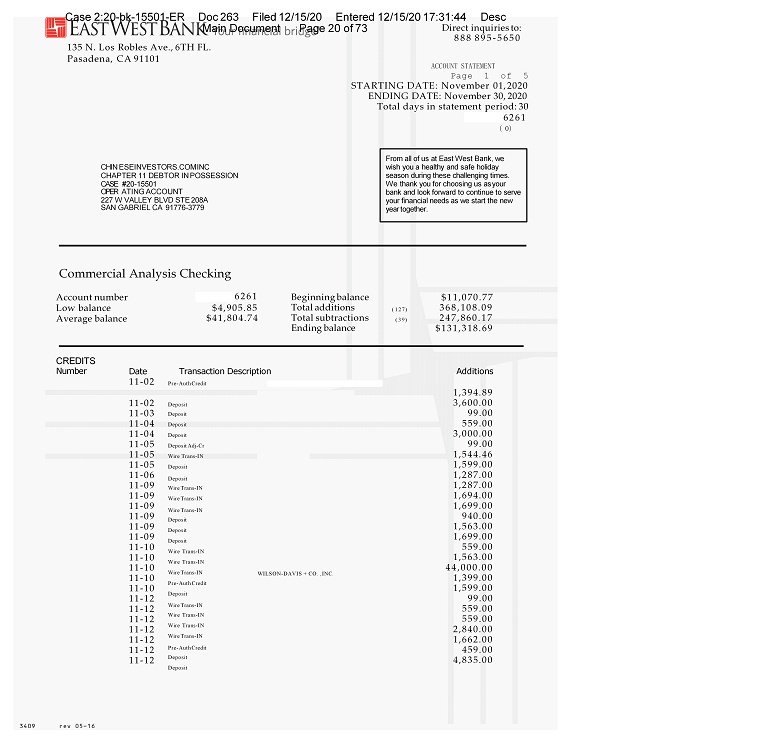 CHIN ESEINVESTORS.COM INC CHAPTER 11 DEBTOR IN POSSESSION CASE #20 - 15501 OPER ATING ACCOUNT 227 W VALLEY BLVD STE 208A SAN GABRIEL CA 91776 - 3779 CREDITS Number Transaction Description Additions 6261 Account number Low balance Average balance $4,905.85 $41,804.74 Beginning balance Total additions Total subtractions Ending balance $11,070.77 368,108.09 247,860.17 $131,318.69 Date 11 - 02 11 - 02 11 - 03 11 - 04 11 - 04 11 - 05 11 - 05 11 - 05 11 - 06 11 - 09 11 - 09 11 - 09 11 - 09 11 - 09 11 - 09 11 - 10 11 - 10 11 - 10 11 - 10 11 - 10 11 - 12 11 - 12 11 - 12 11 - 12 11 - 12 11 - 12 11 - 12 1,394.89 3,600.00 99.00 559.00 3,000.00 99.00 1,544.46 1,599.00 1,287.00 1,287.00 1,694.00 1,699.00 940.00 1,563.00 1,699.00 559.00 1,563.00 44,000.00 1,399.00 1,599.00 99.00 559.00 559.00 2,840.00 1,662.00 459.00 4,835.00 135 N. Los Robles Ave., 6TH FL. Pasadena, CA 91101 6261 ( 0) Direct inquiries to: 888 895 - 5650 ( 127) ( 39) Pre - Auth Credit Deposit Deposit Deposit Deposit Deposit Adj - Cr Wire Trans - IN Deposit Deposit Wire Trans - IN Wire Trans - IN Wire Trans - IN Deposit Deposit Deposit Wire Trans - IN Wire Trans - IN Wire Trans - IN WILSON - DAVIS + CO. , INC. Pre - Auth Credit Deposit Wire Trans - IN Wire Trans - IN Wire Trans - IN Wire Trans - IN Pre - Auth Credit Deposit Deposit Commercial Analysis Checking From all of us at East West Bank, we wish you a healthy and safe holiday season during these challenging times. We thank you for choosing us as your bank and look forward to continue to serve your financial needs as we start the new year together. ACCOUNT STATEMENT Page 1 of 5 STARTING DATE: November 01, 2020 ENDING DATE: November 30, 2020 Total days in statement period: 30 Case 2:20 - bk - 15501 - ER Doc 263 Filed 12/15/20 Entered 12/15/20 17:31:44 Desc Main Document Page 20 of 73