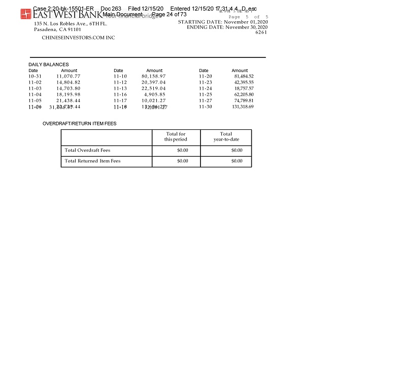 DAILY BALANCES OVERDRAFT/RETURN ITEM FEES 11 - 09 31,038.97 11 - 19 12,201.27 Date Amount Date Amount Date Amount 10 - 31 11,070.77 11 - 10 80,158.97 11 - 20 81,484.52 11 - 02 14,804.82 11 - 12 20,397.04 11 - 23 42,395.55 11 - 03 14,703.80 11 - 13 22,519.04 11 - 24 18,757.57 11 - 04 18,195.98 11 - 16 4,905.85 11 - 25 62,205.80 11 - 05 21,438.44 11 - 17 10,021.27 11 - 27 74,789.81 11 - 06 22,725.44 11 - 18 13,606.27 11 - 30 131,318.69 STARTING DATE: November 01, 2020 ENDING DATE: November 30, 2020 6261 135 N. Los Robles Ave., 6TH FL. Pasadena, CA 91101 CHINESEINVESTORS.COM INC Total for this period Total year - to - date Total Overdraft Fees $0.00 $0.00 Total Returned Item Fees $0.00 $0.00 Page 5 of 5 Case 2:20 - bk - 15501 - ER Doc 263 Filed 12/15/20 Entered 12/15/20 17 AC : C 3 O 1 UN : T 4 S 4 TATE D MEN e T sc Main Document Page 24 of 73