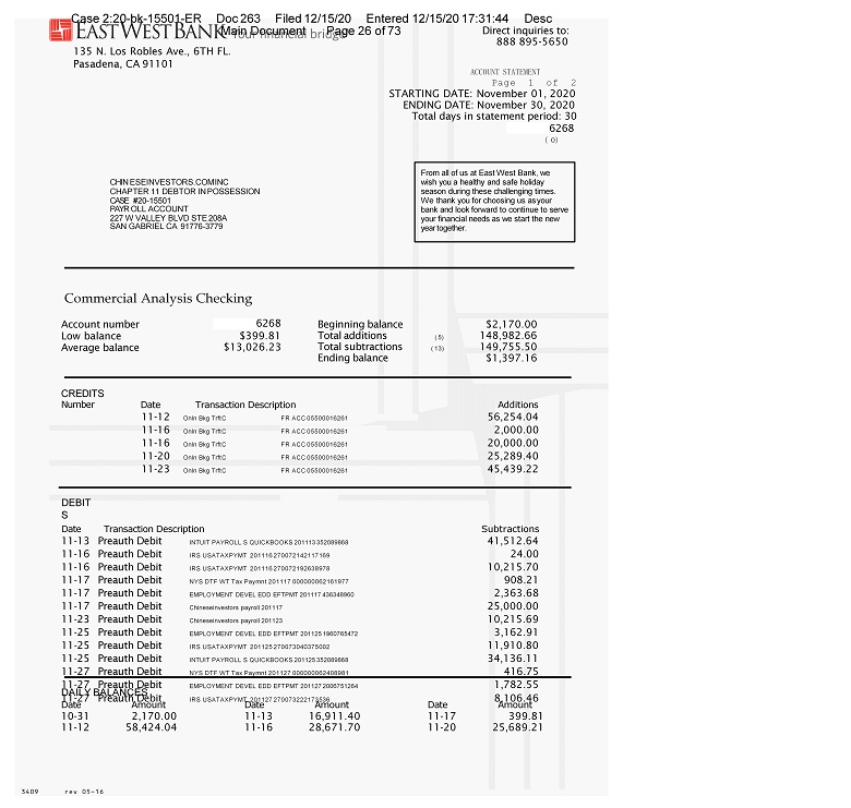 CHIN ESEINVESTORS.COM INC CHAPTER 11 DEBTOR IN POSSESSION CASE #20 - 15501 PAYR OLL ACCOUNT 227 W VALLEY BLVD STE 208A SAN GABRIEL CA 91776 - 3779 DAILY BALANCES CREDITS Number Date Transaction Description Additions 6268 Account number Low balance Average balance $399.81 $13,026.23 Beginning balance Total additions Total subtractions Ending balance $2,170.00 148,982.66 149,755.50 $1,397.16 Date 10 - 31 11 - 12 Amount 2,170.00 58,424.04 Date 11 - 13 11 - 16 Amount 16,911.40 28,671.70 Date 11 - 17 11 - 20 Amount 399.81 25,689.21 135 N. Los Robles Ave., 6TH FL. Pasadena, CA 91101 6268 ( 0) Direct inquiries to: 888 895 - 5650 ( 5) ( 13) Commercial Analysis Checking 11 - 12 Onln Bkg Trft C FR ACC 05500016261 56,254.04 11 - 16 Onln Bkg Trft C FR ACC 05500016261 2,000.00 11 - 16 Onln Bkg Trft C FR ACC 05500016261 20,000.00 11 - 20 Onln Bkg Trft C FR ACC 05500016261 25,289.40 11 - 23 Onln Bkg Trft C FR ACC 05500016261 45,439.22 DEBIT S Date Transaction Description Subtractions 11 - 13 Preauth Debit INTUIT PAYROLL S QUICKBOOKS 201113 352089868 41,512.64 11 - 16 Preauth Debit IRS USATAXPYMT 201116 270072142117169 24.00 11 - 16 Preauth Debit IRS USATAXPYMT 201116 270072192638978 10,215.70 11 - 17 Preauth Debit NYS DTF WT Tax Paymnt 201117 000000062161977 908.21 11 - 17 Preauth Debit EMPLOYMENT DEVEL EDD EFTPMT 201117 436348960 2,363.68 11 - 17 Preauth Debit Chineseinvestors payroll 201117 25,000.00 11 - 23 Preauth Debit Chineseinvestors payroll 201123 10,215.69 11 - 25 Preauth Debit EMPLOYMENT DEVEL EDD EFTPMT 201125 1960765472 3,162.91 11 - 25 Preauth Debit IRS USATAXPYMT 201125 270073040375002 11,910.80 11 - 25 Preauth Debit INTUIT PAYROLL S QUICKBOOKS 201125 352089868 34,136.11 11 - 27 Preauth Debit NYS DTF WT Tax Paymnt 201127 000000062408981 416.75 11 - 27 Preauth Debit EMPLOYMENT DEVEL EDD EFTPMT 201127 2006751264 1,782.55 11 - 27 Preauth Debit IRS USATAXPYMT 201127 270073222173536 8,106.46 From all of us at East West Bank, we wish you a healthy and safe holiday season during these challenging times. We thank you for choosing us as your bank and look forward to continue to serve your financial needs as we start the new year together. ACCOUNT STATEMENT Page 1 of 2 STARTING DATE: November 01, 2020 ENDING DATE: November 30, 2020 Total days in statement period: 30 Case 2:20 - bk - 15501 - ER Doc 263 Filed 12/15/20 Entered 12/15/20 17:31:44 Desc Main Document Page 26 of 73