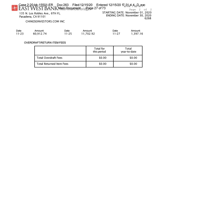 OVERDRAFT/RETURN ITEM FEES Date 11 - 23 Amount 60,912.74 Date 11 - 25 Amount 11,702.92 Date 11 - 27 Amount 1,397.16 STARTING DATE: November 01, 2020 ENDING DATE: November 30, 2020 6268 135 N. Los Robles Ave., 6TH FL. Pasadena, CA 91101 CHINESEINVESTORS.COM INC Total for this period Total year - to - date Total Overdraft Fees $0.00 $0.00 Total Returned Item Fees $0.00 $0.00 Page 2 of 2 Case 2:20 - bk - 15501 - ER Doc 263 Filed 12/15/20 Entered 12/15/20 17 AC : C 3 O 1 UN : T 4 S 4 TATE D MEN e T sc Main Document Page 27 of 73