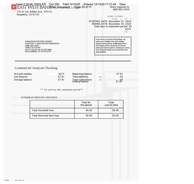 CHIN ESEINVESTORS.COM INC CHAPTER 11 DEBTOR IN POSSESSION CASE #20 - 15501 TAXE S ACCOUNT 227 W VALLEY BLVD STE 208A SAN GABRIEL CA 91776 - 3779 ** No activity this statement period ** OVERDRAFT/RETURN ITEM FEES Ending balance $7.81 135 N. Los Robles Ave., 6TH FL. Pasadena, CA 91101 6275 ( 0) Direct inquiries to: 888 895 - 5650 Account number 6275 Beginning balance $7.81 Low balance $7.81 Total additions ( 0) .00 Average balance $7.81 Total subtractions ( 0) .00 Commercial Analysis Checking Total for this period Total year - to - date Total Overdraft Fees $0.00 $0.00 Total Returned Item Fees $0.00 $0.00 From all of us at East West Bank, we wish you a healthy and safe holiday season during these challenging times. We thank you for choosing us as your bank and look forward to continue to serve your financial needs as we start the new year together. ACCOUNT STATEMENT Page 1 of 1 STARTING DATE: November 01, 2020 ENDING DATE: November 30, 2020 Total days in statement period: 30 Case 2:20 - bk - 15501 - ER Doc 263 Filed 12/15/20 Entered 12/15/20 17:31:44 Desc Main Document Page 29 of 73
