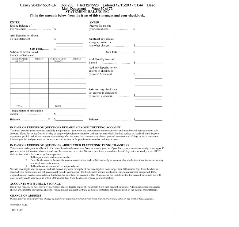 NEWCOINS 0455 ACCOUNT DUE TO NO TRANSACTION OCCURRED DURING NOVEMBER 1 ST TO NOVERMBER 31 ST 2020 NO STATEMENT CAN BE GENGERATED Case 2:20 - bk - 15501 - ER Doc 263 Filed 12/15/20 Entered 12/15/20 17:31:44 Desc Main Document Page 32 of 73