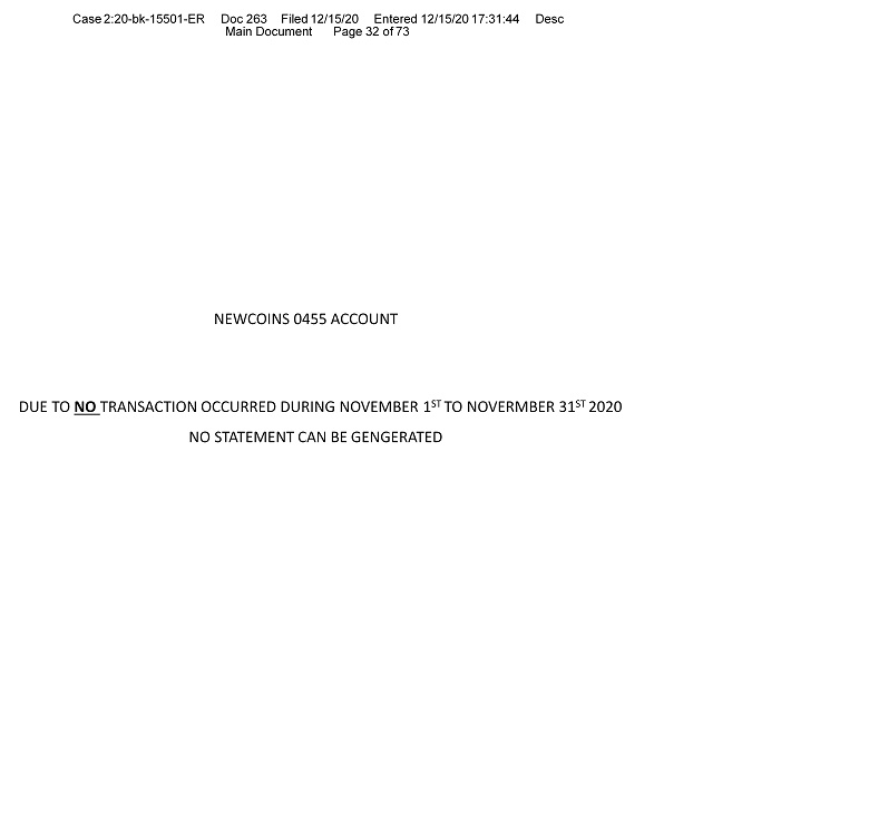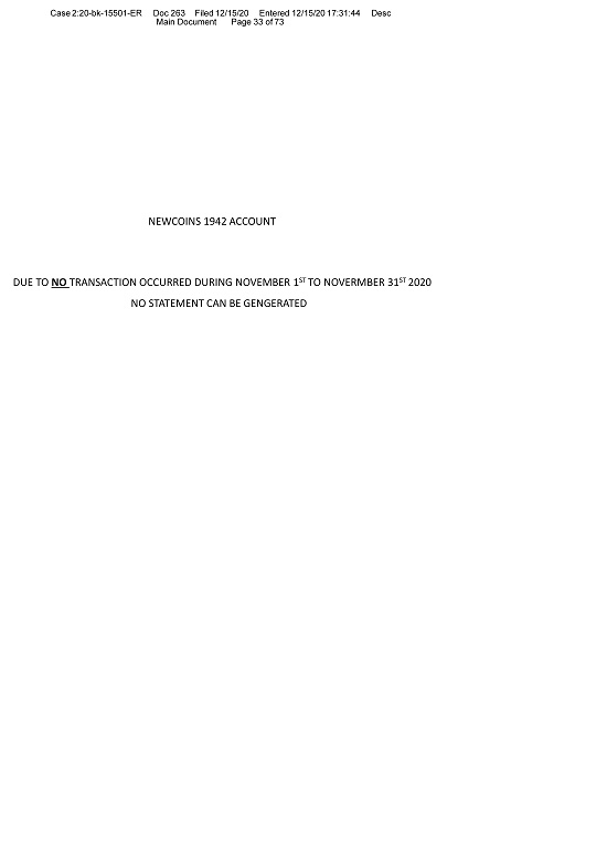 NEWCOINS 1942 ACCOUNT DUE TO NO TRANSACTION OCCURRED DURING NOVEMBER 1 ST TO NOVERMBER 31 ST 2020 NO STATEMENT CAN BE GENGERATED Case 2:20 - bk - 15501 - ER Doc 263 Filed 12/15/20 Entered 12/15/20 17:31:44 Desc Main Document Page 33 of 73