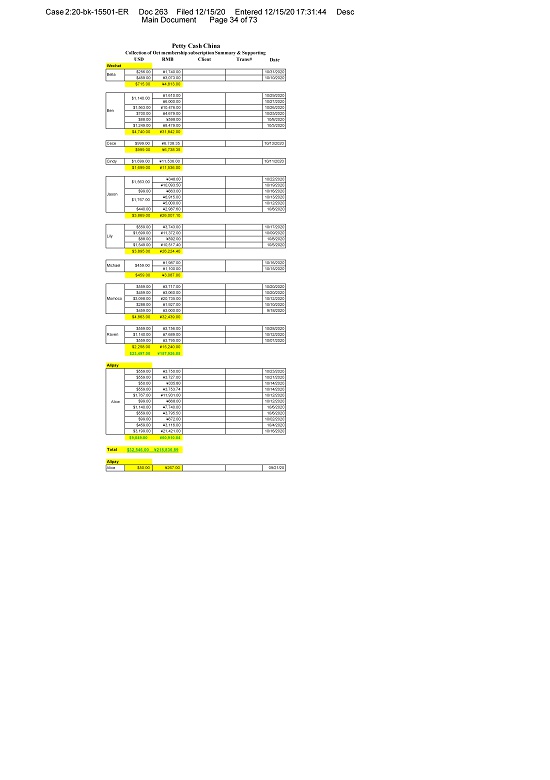 Date $715.00 ¥4,813.00 $4,740.00 ¥31,842.00 $999.00 ¥6,738.35 $1,699.00 ¥11,536.00 $3,869.00 ¥26,007.10 $3,895.00 ¥26,224.40 $459.00 ¥3,087.00 $4,863.00 ¥32,439.00 $2,258.00 ¥15,240.00 $23,497.00 ¥157,926.85 $9,049.00 ¥60,910.04 Total $32,546.00 ¥218,836.89 Petty Cash China Collection of Oct membership subscription Summary & Supporting USD RMB Client Trans # Wechat Bella $256 . 00 ¥1 , 740 . 00 10 / 31 / 2020 $459 . 00 ¥3 , 073 . 00 10 / 10 / 2020 Ben $1,140.00 ¥1 , 610 . 00 10 / 29 / 2020 ¥6 , 000 . 00 10 / 27 / 2020 $1 , 563 . 00 ¥10 , 476 . 00 10 / 26 / 2020 $700 . 00 ¥4 , 679 . 00 10 / 25 / 2020 $88 . 00 ¥598 . 00 10 / 8 / 2020 $1 , 249 . 00 ¥8 , 479 . 00 10 / 3 / 2020 Cece $999.00 ¥6,738.35 10 / 13 / 2020 Cindy $1,699.00 ¥11,536.00 10 / 11 / 2020 Jason $1,563.00 ¥348 . 00 10 / 22 / 2020 ¥10 , 093 . 50 10 / 19 / 2020 $99 . 00 ¥663 . 00 10 / 16 / 2020 $1,767.00 ¥6 , 915 . 00 10 / 13 / 2020 ¥5 , 000 . 00 10 / 12 / 2020 $440 . 00 ¥2 , 987 . 60 10 / 8 / 2020 Lily $559 . 00 ¥3 , 743 . 00 10 / 17 / 2020 $1 , 699 . 00 ¥11 , 372 . 00 10 / 09 / 2020 $88 . 00 ¥592 . 00 10 / 8 / 2020 $1 , 549 . 00 ¥10 , 517 . 40 10 / 5 / 2020 Michael $459.00 ¥1 , 987 . 00 10 / 16 / 2020 ¥1 , 100 . 00 10 / 15 / 2020 Momoco $559 . 00 ¥3 , 717 . 00 10 / 20 / 2020 $459 . 00 ¥3 , 060 . 00 10 / 20 / 2020 $3 , 098 . 00 ¥20 , 735 . 00 10 / 12 / 2020 $288 . 00 ¥1 , 927 . 00 10 / 10 / 2020 $459 . 00 ¥3 , 000 . 00 9 / 18 / 2020 Raven $559 . 00 ¥3 , 756 . 00 10 / 28 / 2020 $1 , 140 . 00 ¥7 , 689 . 00 10 / 12 / 2020 $559 . 00 ¥3 , 795 . 00 10 / 07 / 2020 Alipay Alice $559 . 00 ¥3 , 750 . 00 10 / 23 / 2020 $559 . 00 ¥3 , 727 . 00 10 / 21 / 2020 $50 . 00 ¥335 . 80 10 / 14 / 2020 $559 . 00 ¥3 , 753 . 74 10 / 14 / 2020 $1 , 767 . 00 ¥11 , 931 . 00 10 / 12 / 2020 $99 . 00 ¥668 . 00 10 / 12 / 2020 $1 , 140 . 00 ¥7 , 740 . 00 10 / 6 / 2020 $559 . 00 ¥3 , 795 . 50 10 / 6 / 2020 $99 . 00 ¥672 . 00 10 / 02 / 2020 $459 . 00 ¥3 , 116 . 00 10 / 4 / 2020 $3 , 199 . 00 ¥21 , 421 . 00 10 / 16 / 2020 Alipay Alice $50.00 ¥267.00 09/21/20 Case 2:20 - bk - 15501 - ER Doc 263 Filed 12/15/20 Entered 12/15/20 17:31:44 Desc Main Document Page 34 of 73