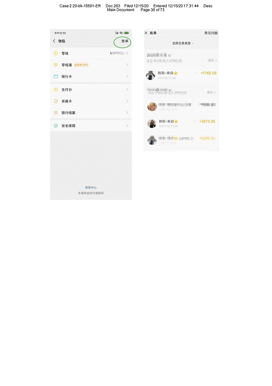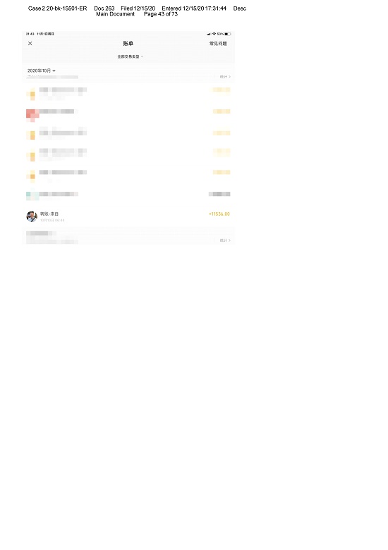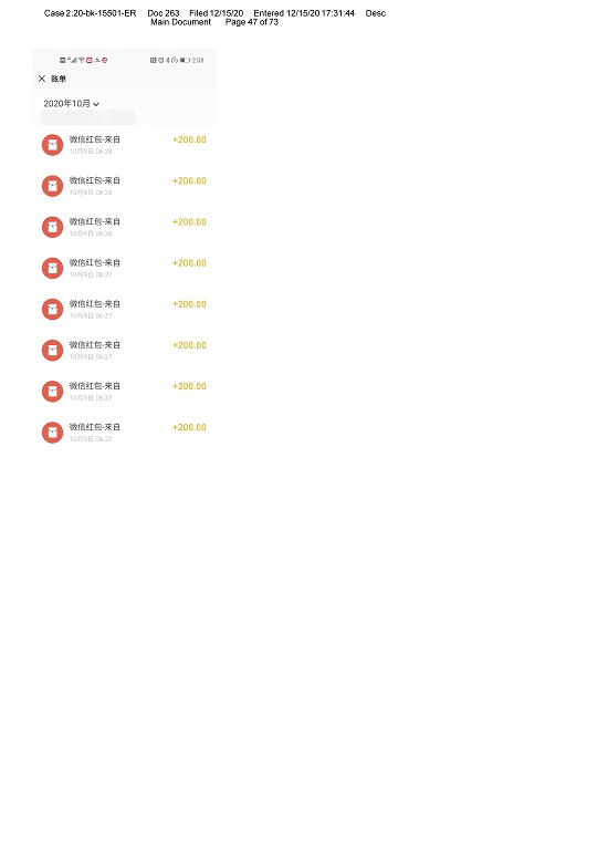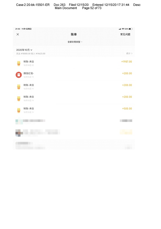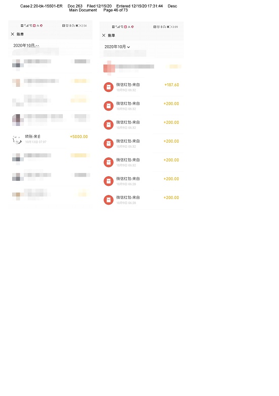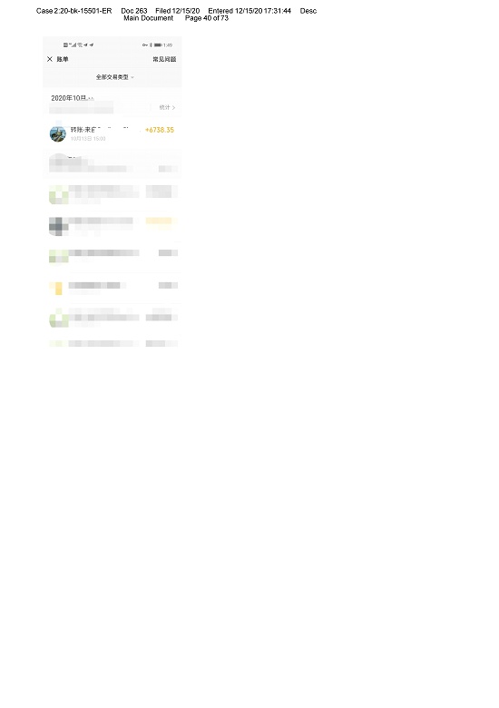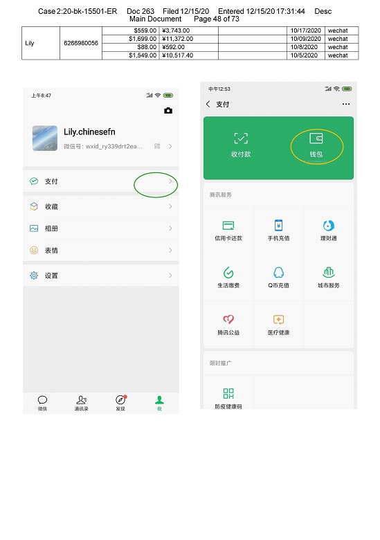 Lily 6266980056 $ 5 5 9 .00 ¥3,743.00 10/17/2020 wechat $ 1 , 6 9 9 . 0 0 ¥11,372.00 10/09/2020 wechat $ 8 8 . 00 ¥592.00 10/8/2020 wechat $ 1 , 5 4 9 . 0 0 ¥10,517.40 10/5/2020 wechat Case 2:20 - bk - 15501 - ER Doc 263 Filed 12/15/20 Entered 12/15/20 17:31:44 Desc Main Document Page 48 of 73