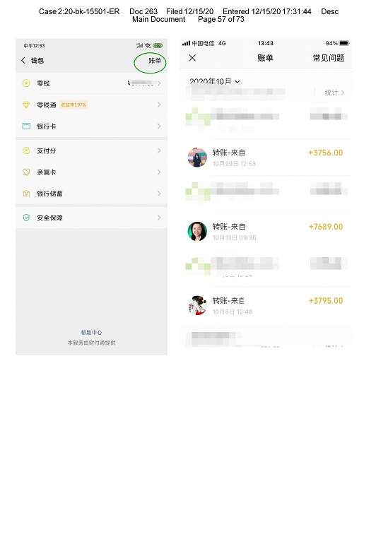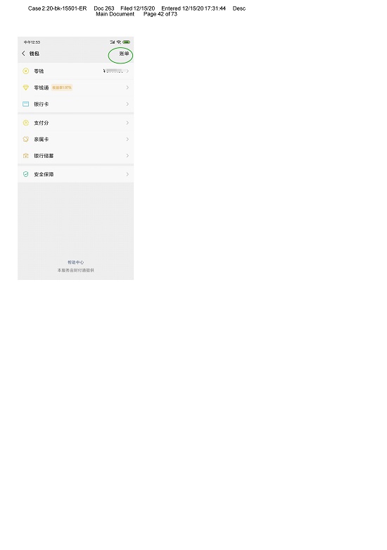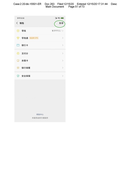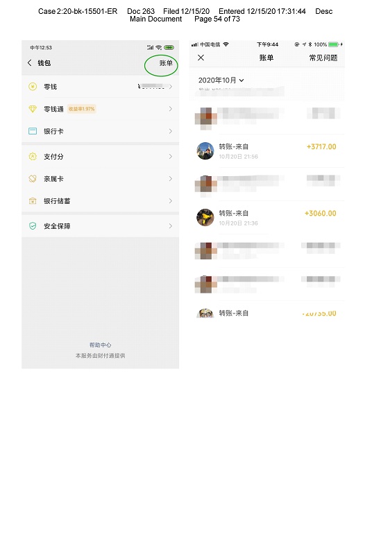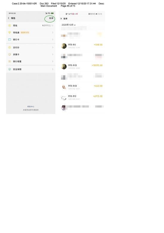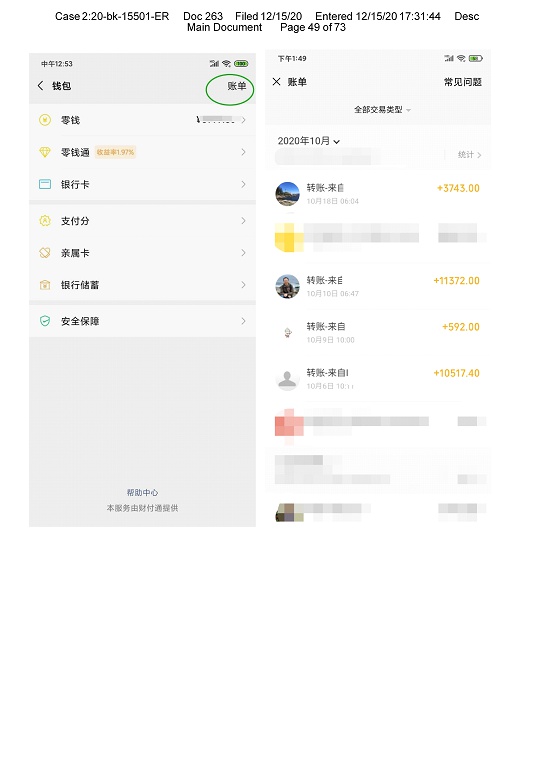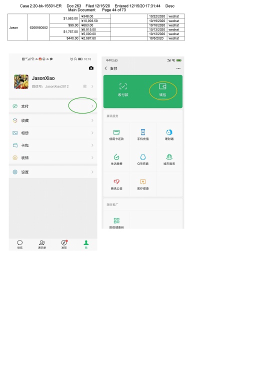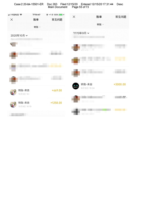 Lily 6266980056 $ 5 5 9 .00 ¥3,743.00 10/17/2020 wechat $ 1 , 6 9 9 . 0 0 ¥11,372.00 10/09/2020 wechat $ 8 8 . 00 ¥592.00 10/8/2020 wechat $ 1 , 5 4 9 . 0 0 ¥10,517.40 10/5/2020 wechat Case 2:20 - bk - 15501 - ER Doc 263 Filed 12/15/20 Entered 12/15/20 17:31:44 Desc Main Document Page 48 of 73