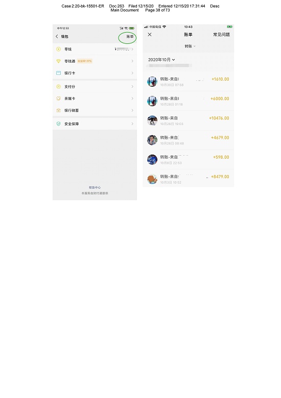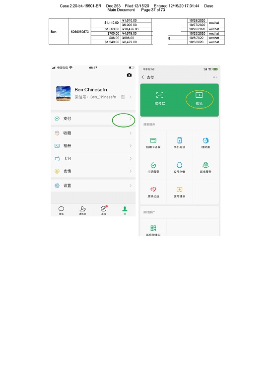 Ben 6266980573 $1,140.00 ¥1,610.00 10/29/2020 wechat ¥6,000.00 10/27/2020 $1,563. 0 0 ¥10,476.00 10/26/2020 wechat $700. 0 0 ¥4,679.00 10/25/2020 wechat $88.00 ¥598.00 g 10/8/2020 wechat $1,249. 0 0 ¥8,479.00 10/3/2020 wechat Case 2:20 - bk - 15501 - ER Doc 263 Filed 12/15/20 Entered 12/15/20 17:31:44 Desc Main Document Page 37 of 73