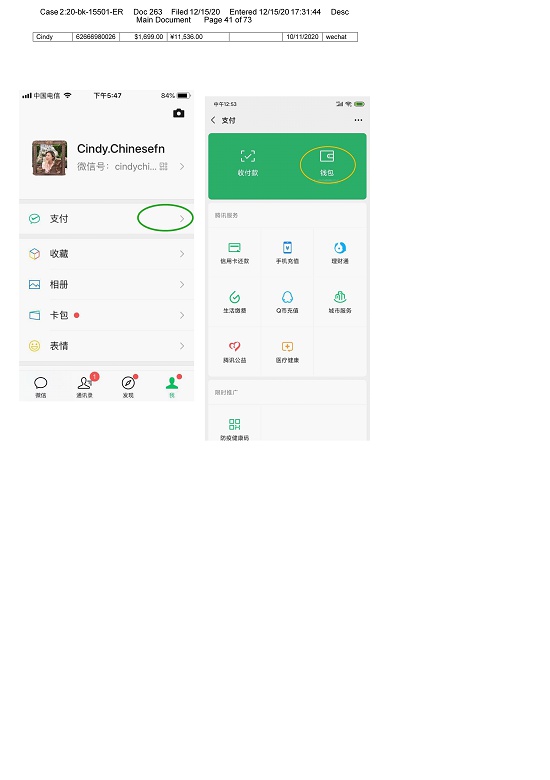 Cindy 62666980026 $1,699.00 ¥11,536.00 10/11/2020 wechat Case 2:20 - bk - 15501 - ER Doc 263 Filed 12/15/20 Entered 12/15/20 17:31:44 Desc Main Document Page 41 of 73
