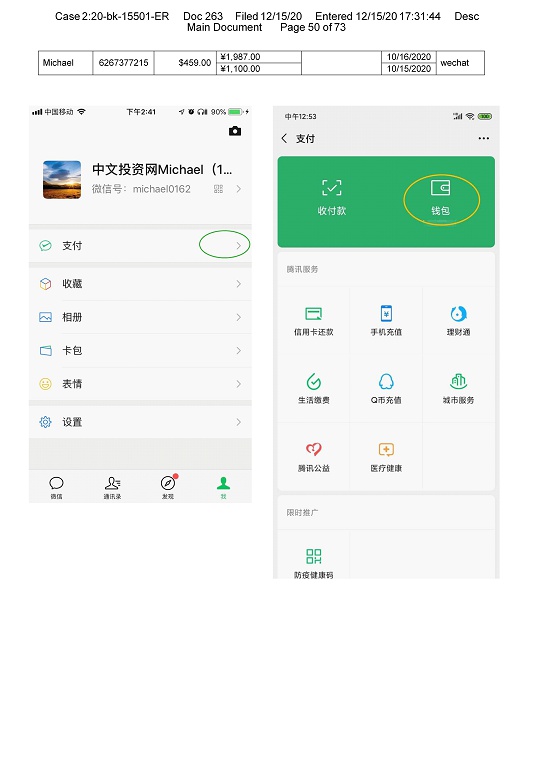 Michael 6267377215 $459.00 ¥1,987.00 10/16/2020 wechat ¥1,100.00 10/15/2020 Case 2:20 - bk - 15501 - ER Doc 263 Filed 12/15/20 Entered 12/15/20 17:31:44 Desc Main Document Page 50 of 73