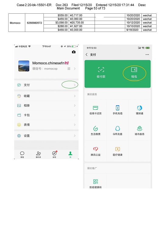 Bella 6266980711 $256. 0 0 ¥1,740.00 $459. 0 0 ¥3,073.00 10/31/2020 wechat 10/10/2020 wechat Wechat summary: Case 2:20 - bk - 15501 - ER Desc Doc 263 Filed 12/15/20 Entered 12/15/20 17:31:44 Main Document Page 35 of 73