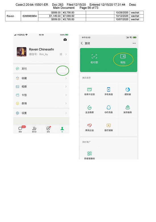 Raven 6266980864 $ 5 5 9 .00 ¥3,756.00 10/28/2020 wechat $ 1 , 1 4 0 . 0 0 ¥7,689.00 10/12/2020 wechat $ 5 5 9 .00 ¥3,795.00 10/07/2020 wechat Case 2:20 - bk - 15501 - ER Doc 263 Filed 12/15/20 Entered 12/15/20 17:31:44 Desc Main Document Page 56 of 73
