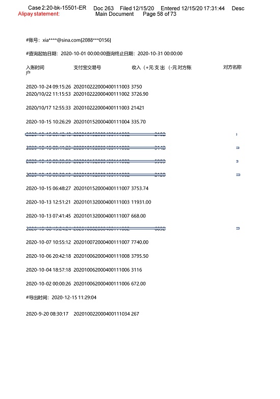# ૃ՚ xia****@sina.com[2088***0156] ثސդ० # ߲તޙ ߊ 2020 - 10 - 01 00:00:00 ߲તৄ࠲ޙ ߊ 2020 - 10 - 31 00:00:00 ҵૃޞ ݵіؗсޣ՚ ݶҵ ͧ + ҫ ݵӟ ͧ - ҫ ثސૃ ۯ 2020 - 10 - 24 09:15:26 202010222000400111003 3750 2020/10/22 11:15:53 202010222000400111002 3726.90 2020/10/17 12:55:33 202010222000400111003 21421 2020 - 10 - 15 10:26:29 202010152000400111004 335.70 2020 - 10 - 15 09:42:48 202010152000400111002 2102 2020 - 10 - 15 09:41:23 202010152000400111002 3142 2020 - 10 - 15 09:39:53 202010152000400111002 5903 2020 - 10 - 15 09:38:19 202010152000400111002 2120 2020 - 10 - 15 06:48:27 202010152000400111007 3753.74 2020 - 10 - 13 12:51:21 202010132000400111003 11931.00 2020 - 10 - 13 07:41:45 202010132000400111007 668.00 2020 - 10 - 08 13:24:24 202010082000400111002 6092 2020 - 10 - 07 10:55:12 202010072000400111007 7740.00 2020 - 10 - 06 20:42:18 202010062000400111008 3795.50 2020 - 10 - 04 18:57:18 202010062000400111006 3116 2020 - 10 - 02 00:00:26 202010062000400111006 672.00 # حӟޞ 2020 - 12 - 15 11:29:04 2020 - 9 - 20 08:30:17 202010022000400111034 267 Case 2:20 - bk - 15501 - ER Alipay statement: Doc 263 Filed 12/15/20 Entered 12/15/20 17:31:44 Desc Main Document Page 58 of 73