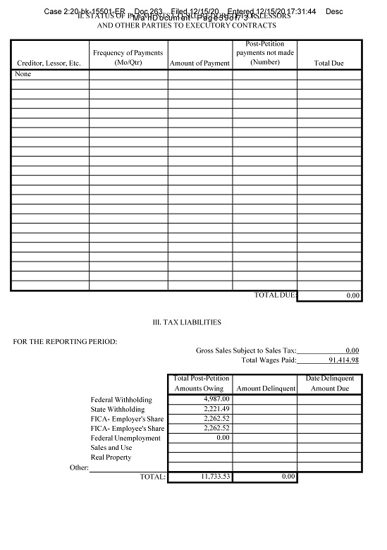 O th er : III. TAX LIABILITIES FOR THE REPORTING PERIOD: Gross Sales Subject to Sales Tax: 0.00 Total Wages Paid: 91,414.98 Creditor, Lessor, Etc. Frequency of Payments (Mo/Qtr) Amount of Payment Post - Petition payments not made (Number) Total Due None TOTAL DUE: 0.00 Total Post - Petition Date Delinquent Amounts Owing Amount Delinquent Amount Due Federal Withholding 4,987.00 State Withholding 2,221.49 FICA - Employer's Share 2,262.52 FICA - Employee's Share 2,262.52 Federal Unemployment 0.00 Sales and Use Real Property T O T A L : 11,733.53 0.00 Case 2:20 - bk - 15501 - ER Doc 263 Filed 12/15/20 Entered 12/15/20 17:31:44 Desc II. STATUS OF PA M Y a M in E D N o T c S u T m O en S t ECU P R a E g D e C 5 R 9 E o D f I 7 T 3 ORS, LESSORS AND OTHER PARTIES TO EXECUTORY CONTRACTS