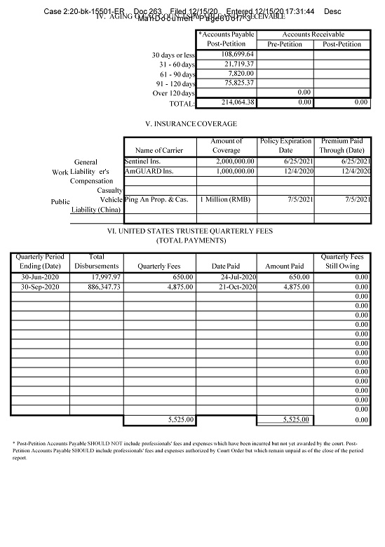 * Post - Petition Accounts Payable SHOULD NOT include professionals' fees and expenses which have been incurred but not yet awarded by the court. Post - Petition Accounts Payable SHOULD include professionals' fees and expenses authorized by Court Order but which remain unpaid as of the close of the period report. 30 days or less 31 - 60 days 61 - 90 days 91 - 120 days Over 120 days TOTAL: V. INSURANCE COVERAGE Work Public VI. UNITED STATES TRUSTEE QUARTERLY FEES (TOTAL PAYMENTS) *Accounts Payable Post - Petition Accounts Receivable Pre - Petition Post - Petition 108,699.64 21,719.37 7,820.00 75,825.37 0.00 214,064.38 0.00 0.00 General Liability er's Compensation C a su a lty Ve hi c le Liability (China) Name of Carrier Amount of Coverage Policy Expiration Date Premium Paid Through (Date) Sentinel Ins. 2,000,000.00 6/25/2021 6/25/2021 AmGUARD Ins. 1,000,000.00 12/4/2020 12/4/2020 Ping An Prop. & Cas. 1 Million (RMB) 7/5/2021 7/5/2021 Quarterly Period Ending (Date) Total Disbursements Quarterly Fees Date Paid Amount Paid Quarterly Fees Still Owing 30 - Jun - 2020 17,997.97 650.00 24 - J ul - 2020 650.00 0.00 30 - Sep - 2020 886,347.73 4,875.00 21 - Oc t - 2020 4,875.00 0.00 0.00 0.00 0.00 0.00 0.00 0.00 0.00 0.00 0.00 0.00 0.00 0.00 0.00 0.00 5,525.00 5,525.00 Case 2:20 - bk - 15501 - ER Doc 263 Filed 12/15/20 Entered 12/15/20 17:31:44 Desc IV. AGING O M F a A in C D C o O c U u N m T e S nt PAY P A a B g L e E 6 A 0 N o D f 7 R 3 ECEIVABLE