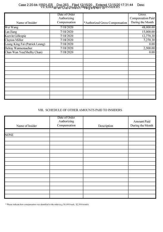 * Please indicate how compensation was identified in the order (e.g. $1,000/week, $2,500/month) VIII. SCHEDULE OF OTHER AMOUNTS PAID TO INSIDERS Name of Insider Date of Order Authorizing Comp e ns a tion *Authorized Gross Compensation Gross Compensation Paid During the Month Wei Wang 7/18/2020 48,000.00 Lan Jiang 7/18/2020 15,000.00 Keevin Gillespie 7/18/2020 12,770.30 Clayton Miller 7/18/2020 7,270.30 Leung King Fai (Patrick Leung) 7/18/2020 0.00 Delray Wannemacher 7/18/2020 2,500.00 Chan Wan Yee(Shelby Chan) 7/18/2020 0.00 Name of Insider Date of Order Authorizing Comp e ns a tion Description Amount Paid During the Month NONE Case 2:20 - bk - 15501 - ER Doc 263 Filed 12/15/20 Entered 12/15/20 17:31:44 Desc VII SCHEDU M LE ain OF D C oc O u M m P e E n N t SAT P I a O g N e P 6 A 1 I o D f T 73 O INSIDERS