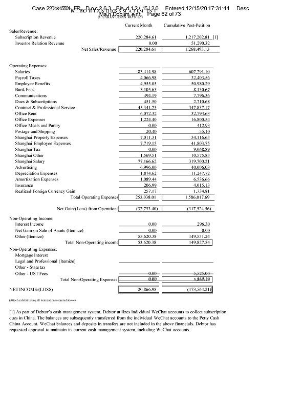Current Month Cumulative Post - Petition Sales/Revenue: 0.00 342.19 0.00 5,525.00 Non - Operating Expenses: Mortgage Interest Legal and Professional (Itemize) Other - State tax Other - UST Fees Total Non - Operating Expenses 0.00 5,867.19 NET INCOME/(LOSS) 20,866.98 (173,564.21) (Attach exhibit listing all itemizations required above) [1] As part of Debtor’s cash management system, Debtor utilizes individual WeChat accounts to collect subscription dues in China. The balances are subsequently transferred from the individual WeChat accounts to the Petty Cash China Account. WeChat balances and deposits in transfers are not included in the above financials. Debtor has requested approval to maintain its current cash management system, including WeChat accounts. Subscription Revenue 220,284.61 1,217,202.81 [1] Investor Relation Revenue 0.00 51,290.32 Net Sales/Revenue 220,284.61 1,268,493.13 Operating Expenses: Salaries 83,414.98 607,291.10 Payroll Taxes 4,066.98 32,403.56 Employee Benefits 4,955.05 50,980.29 Bank Fees 3,105.63 8,130.67 Communications 494.19 7,796.36 Dues & Subscriiptions 451.50 2,710.68 Contract & Professional Service 45,341.75 347,837.17 Office Rent 6,072.32 32,793.63 Office Expenses 1,224.40 16,800.54 Office Meals and Pantry 0.00 412.93 Postage and Shipping 20.40 55.10 Shanghai Property Expenses 7,011.31 34,116.63 Shanghai Employee Expenses 7,719.15 41,803.75 Shanghai Tax 0.00 9,068.89 Shanghai Other 1,569.51 10,575.83 Shanghai Salary 77,166.62 319,700.21 Advertising 6,996.00 40,006.03 Depreciation Expenses 1,874.62 11,247.72 Amortization Expenses 1,089.44 6,536.66 Insurance 206.99 4,015.13 Realized Foreign Currency Gain 257.17 1,734.81 Total Operating Expenses 253,038.01 1,586,017.69 Net Gain/(Loss) from Operations (32,753.40) (317,524.56) Non - Operating Income: Interest Income 0.00 296.30 Net Gain on Sale of Assets (Itemize) 0.00 0.00 Other (Itemize) 53,620.38 149,531.24 Total Non - Operating income 53,620.38 149,827.54 Case 2:20 - bk - 15501 - IX E . R PRO D FI o T c A 2 N 6 D 3 LOS F S ile ST d A 1 T 2 E / M 15 E / N 2 T 0 Entered 12/15/20 17:31:44 Desc (A M C a CR in UA D L o B c A u S m IS O e N n L t Y) Page 62 of 73