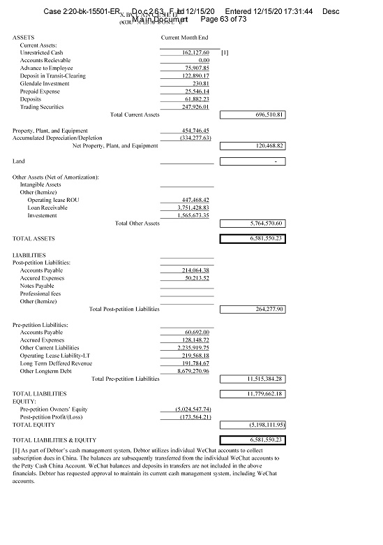 [1] As part of Debtor’s cash management system, Debtor utilizes individual WeChat accounts to collect subscription dues in China. The balances are subsequently transferred from the individual WeChat accounts to the Petty Cash China Account. WeChat balances and deposits in transfers are not included in the above financials. Debtor has requested approval to maintain its current cash management system, including WeChat accounts. ASSETS Current Assets: Current Month End Unrestricted Cash 162,127.60 [1] Accounts Recievable 0.00 Advance to Employee 75,907.85 Deposit in Transit - Clearing 122,890.17 Glendale Investment 230.81 Prepaid Expense 25,546.14 Deposits 61,882.23 Trading Securities 247,926.01 Total Current Assets 696,510.81 Property, Plant, and Equipment 454,746.45 Accumulated Depreciation/Depletion (334,277.63) Net Property, Plant, and Equipment 120,468.82 Land - Other Assets (Net of Amortization): Intangible Assets Other (Itemize) Operating lease ROU 447,468.42 Loan Receivable 3,751,428.83 Investement 1,565,673.35 Total Other Assets 5,764,570.60 TOTAL ASSETS 6,581,550.23 LIABILITIES Post - petition Liabilities: Accounts Payable 214,064.38 Accured Expenses 50,213.52 Notes Payable Professional fees Other (Itemize) Total Post - petition Liabilities 264,277.90 Pre - petition Liabilities: Accounts Payable 60,692.00 Accrued Expenses 128,148.72 Other Current Liabilities 2,235,919.75 Operating Lease Liability - LT 219,568.18 Long Term Deffered Revenue 191,784.67 Other Longterm Debt 8,679,270.96 Total Pre - petition Liabilities 11,515,384.28 TOTAL LIABILITIES 11,779,662.18 EQUITY: Pre - petition Owners’ Equity (5,024,547.74) Post - petition Profit/(Loss) (173,564.21) TOTAL EQUITY ( 5,198,111.95) TOTAL LIABILITIES & EQUITY 6,581,550.23 Case 2:20 - bk - 15501 - ER X. BA D L o A c N 2 C 6 E 3 SHE F ET iled 12/15/20 Entered 12/15/20 17:31:44 Desc (ACCRU M A a L i B n AS D IS o O c N u L m Y) ent Page 63 of 73