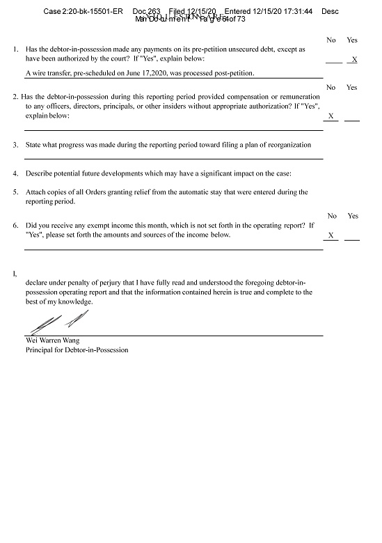 No Yes X 1. Has the debtor - in - possession made any payments on its pre - petition unsecured debt, except as have been authorized by the court? If "Yes", explain below: A wire transfer, pre - scheduled on June 17,2020, was processed post - petition. No Y e s 2 . Has the debtor - in - possession during this reporting period provided compensation or remuneration to any officers, directors, principals, or other insiders without appropriate authorization? If "Yes", explain below : X 3. State what progress was made during the reporting period toward filing a plan of reorganization 4. Describe potential future developments which may have a significant impact on the case: 5. Attach copies of all Orders granting relief from the automatic stay that were entered during the reporting period. No Y e s 6. Did you receive any exempt income this month, which is not set forth in the operating report? If "Yes", please set forth the amounts and sources of the income below. X I, declare under penalty of perjury that I have fully read and understood the foregoing debtor - in - possession operating report and that the information contained herein is true and complete to the best of my knowledge. Wei Warren Wang Principal for Debtor - in - Possession Case 2:20 - bk - 15501 - ER Do c 26 3 File d 12/15/2 0 Entere d 12/15/2 0 17:31:4 4 Desc Main X D I. o Q cu U m E e S n T t IONN Pa A g IR e E 64 of 73