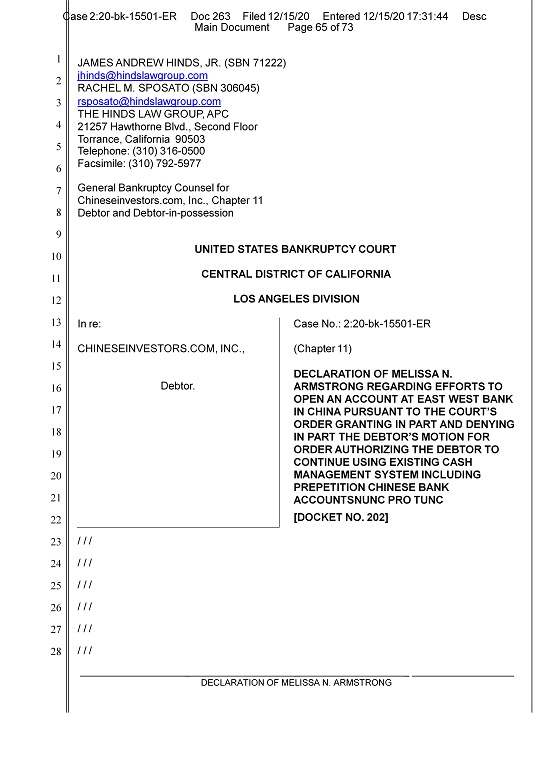 _ _ _ DECLARATION OF MELISSA N. ARMSTRONG 1 2 3 4 5 6 7 8 9 10 11 12 13 14 15 16 17 18 19 20 21 22 23 24 25 26 27 28 JAMES ANDREW HINDS, JR. (SBN 71222) jhinds@hindslawgroup.com RACHEL M. SPOSATO (SBN 306045) rsposato@hindslawgroup.com THE HINDS LAW GROUP, APC 21257 Hawthorne Blvd., Second Floor Torrance, California 90503 Telephone: (310) 316 - 0500 Facsimile: (310) 792 - 5977 General Bankruptcy Counsel for Chineseinvestors.com, Inc., Chapter 11 Debtor and Debtor - in - possession UNITED STATES BANKRUPTCY COURT CENTRAL DISTRICT OF CALIFORNIA LOS ANGELES DIVISION In re: CHINESEINVESTORS.COM, INC., Debtor. Case No.: 2:20 - bk - 15501 - ER (Chapter 11) DECLARATION OF MELISSA N. ARMSTRONG REGARDING EFFORTS TO OPEN AN ACCOUNT AT EAST WEST BANK IN CHINA PURSUANT TO THE COURT’S ORDER GRANTING IN PART AND DENYING IN PART THE DEBTOR’S MOTION FOR ORDER AUTHORIZING THE DEBTOR TO CONTINUE USING EXISTING CASH MANAGEMENT SYSTEM INCLUDING PREPETITION CHINESE BANK ACCOUNTSNUNC PRO TUNC [DOCKET NO. 202] / / / / / / / / / / / / / / / / / / Case 2:20 - bk - 15501 - ER Doc 263 Filed 12/15/20 Entered 12/15/20 17:31:44 Desc Main Document Page 65 of 73