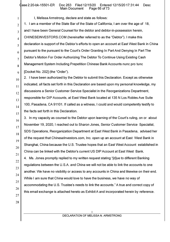 1 DECLARATION OF MELISSA N. ARMSTRONG 1 2 3 4 5 6 7 8 9 10 11 12 13 14 15 16 17 18 19 20 21 22 23 24 25 26 27 28 I, Melissa Armstrong, declare and state as follows: 1. I am a member of the State Bar of the State of California, I am over the age of 18, and I have been General Counsel for the debtor and debtor - in - possession herein, CHINESEINVESTORS.COM (hereinafter referred to as the “Debtor”). I make this declaration is support of the Debtor’s efforts to open an account at East West Bank in China pursuant to the pursuant to the Court’s Order Granting In Part And Denying In Part The Debtor’s Motion For Order Authorizing The Debtor To Continue Using Existing Cash Management System Including Prepetition Chinese Bank Accounts nunc pro tunc [Docket No. 202] (the “Order”). 2. I have been authorized by the Debtor to submit this Declaration. Except as otherwise indicated, all facts set forth in this Declaration are based upon my personal knowledge, my discussions a Senior Customer Service Specialist in the Reorganizations Department, responsible for DIP Accounts, at East West Bank located at 135 N Los Robles Ave Suite 100, Pasadena, CA 91101. If called as a witness, I could and would competently testify to the facts set forth in this Declaration. 3. In my capacity as counsel to the Debtor upon learning of the Court’s ruling, on or about November 19, 2020, I reached out to Sharon Jones, Senior Customer Service Specialist, SDS Operations, Reorganization Department at East West Bank in Pasadena, advised her of the request that ChineseInvestors.com, Inc. open up an account at East West Bank in Shanghai, China because the U.S. Trustee hopes that an East West Account established in China can be linked with the Debtor's current US DIP Account at East West Bank. 4. Ms. Jones promptly replied to my written request stating “[d]ue to different Banking regulations between the U.S.A. and China we will not be able to link the accounts to one another. We have no visibility or access to any accounts in China and likewise on their end. While I am sure that China would love to have the business, we have no way of accommodating the U.S. Trustee’s needs to link the accounts.” A true and correct copy of this email exchange is attached hereto as Exhibit A and incorporated herein by reference. Case 2:20 - bk - 15501 - ER Doc 263 Filed 12/15/20 Entered 12/15/20 17:31:44 Desc Main Document Page 66 of 73