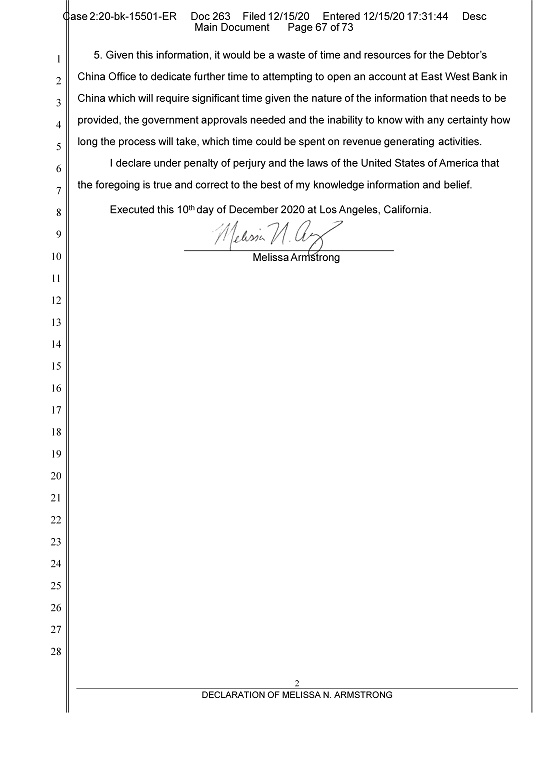 2 DECLARATION OF MELISSA N. ARMSTRONG 1 2 3 4 5 6 7 8 9 10 11 12 13 14 15 16 17 18 19 20 21 22 23 24 25 26 27 28 5. Given this information, it would be a waste of time and resources for the Debtor’s China Office to dedicate further time to attempting to open an account at East West Bank in China which will require significant time given the nature of the information that needs to be provided, the government approvals needed and the inability to know with any certainty how long the process will take, which time could be spent on revenue generating activities. I declare under penalty of perjury and the laws of the United States of America that the foregoing is true and correct to the best of my knowledge information and belief. Executed this 10 th day of December 2020 at Los Angeles, California. Melissa Armstrong Case 2:20 - bk - 15501 - ER Doc 263 Filed 12/15/20 Entered 12/15/20 17:31:44 Desc Main Document Page 67 of 73
