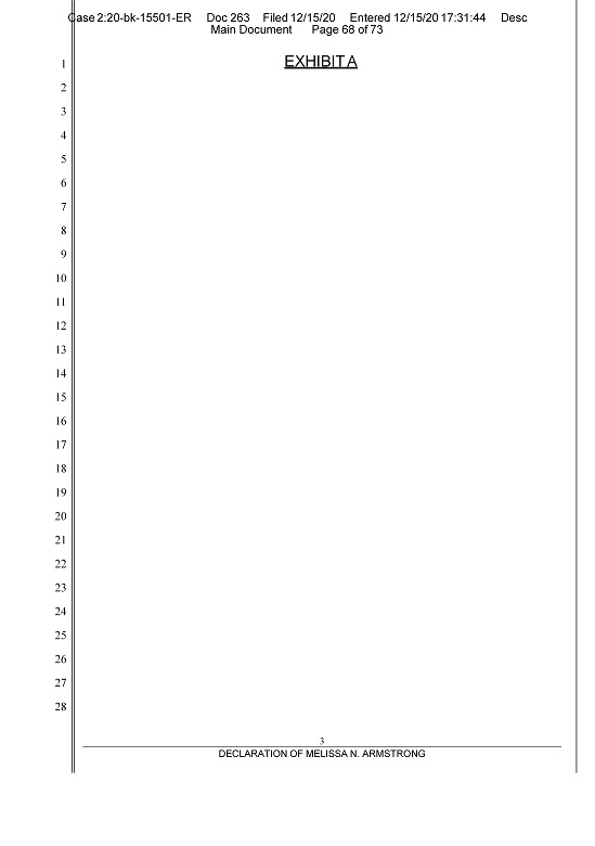 3 DECLARATION OF MELISSA N. ARMSTRONG 1 2 3 4 5 6 7 8 9 10 11 12 13 14 15 16 17 18 19 20 21 22 23 24 25 26 27 28 EXHIBIT A Case 2:20 - bk - 15501 - ER Doc 263 Filed 12/15/20 Entered 12/15/20 17:31:44 Desc Main Document Page 68 of 73