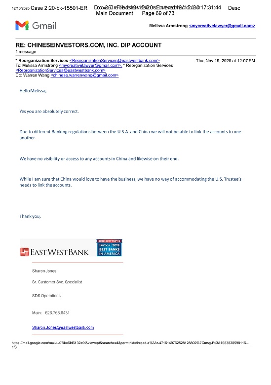 https://mail.google.com/mail/u/0?ik=6fd6132a9f&view=pt&search=all&permthid=thread - a%3Ar - 4716149762528128802%7Cmsg - f%3A1683820598 116… 1/3 Melissa Armstrong <mycreativelawyer@gmail.com> RE: CHINESEINVESTORS.COM, INC. DIP ACCOUNT 1 message Thu, Nov 19, 2020 at 12:07 PM * Reorganization Services <ReorganizationServices@eastwestbank.com> To: Melissa Armstrong <mycreativelawyer@gmail.com>, * Reorganization Services <ReorganizationServices@eastwestbank.com> Cc: Warren Wang <chinese.warrenwang@gmail.com> Hello Melissa, Yes you are absolutely correct. Due to different Banking regulations between the U.S.A. and China we will not be able to link the accounts to one another. We have no visibility or access to any accounts in China and likewise on their end. While I am sure that China would love to have the business, we have no way of accommodating the U.S. Trustee’s needs to link the accounts. Thank you, Sharon Jones Sr. Customer Svc. Specialist SDS Operations Main: 626.768.6431 Sharon.Jones@eastwestbank.com 12/10/2020 Case 2:20 - bk - 15501 - ER Desc Doc Gm 2 a 6 il 3 - RE: F C i H le IN d ES 1 E 2 IN / V 1 E 5 S / T 2 O 0 RS.C E O n M t , e IN r C e . d DI 1 P 2 A / C 1 C 5 O / U 2 N 0 T 17:31:44 Main Document Page 69 of 73