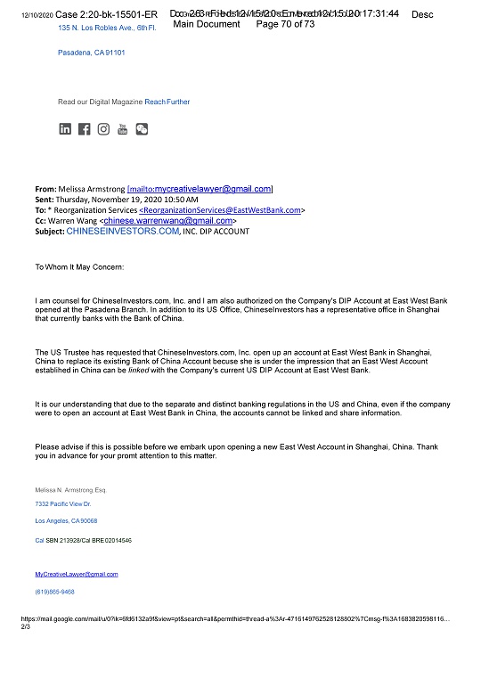 https://mail.google.com/mail/u/0?ik=6fd6132a9f&view=pt&search=all&permthid=thread - a%3Ar - 4716149762528128802%7Cmsg - f%3A1683820598 116… 2/3 Pasadena, CA 91101 Read our Digital Magazine Reach Further From: Melissa Armstrong [mailto: mycreativelawyer@gmail.com ] Sent: Thursday, November 19, 2020 10:50 AM To: * Reorganization Services <ReorganizationServices@EastWestBank.com > Cc: Warren Wang < chinese.warrenwang@gmail.com > Subject: CHINESEINVESTORS.COM , INC. DIP ACCOUNT To Whom It May Concern: I am counsel for ChineseInvestors.com, Inc. and I am also authorized on the Company's DIP Account at East West Bank opened at the Pasadena Branch. In addition to its US Office, ChineseInvestors has a representative office in Shanghai that currently banks with the Bank of China. The US Trustee has requested that ChineseInvestors.com, Inc. open up an account at East West Bank in Shanghai, China to replace its existing Bank of China Account becuse she is under the impression that an East West Account establihed in China can be linked with the Company's current US DIP Account at East West Bank. It is our understanding that due to the separate and distinct banking regulations in the US and China, even if the company were to open an account at East West Bank in China, the accounts cannot be linked and share information. Please advise if this is possible before we embark upon opening a new East West Account in Shanghai, China. Thank you in advance for your promt attention to this matter. Melissa N. Armstrong, Esq. 7332 Pacific View Dr. Los Angeles, CA 90068 Cal SBN 213928/Cal BRE 02014546 MyCreativeLawyer@gmail.com (619)865 - 9468 12/10/2020 Case 2:20 - bk - 15501 - ER 135 N. Los Robles Ave., 6th Fl. Desc Doc Gm 2 a 6 il 3 - RE: F C i H le IN d ES 1 E 2 IN / V 1 E 5 S / T 2 O 0 RS.C E O n M t , e IN r C e . d DI 1 P 2 A / C 1 C 5 O / U 2 N 0 T 17:31:44 Main Document Page 70 of 73