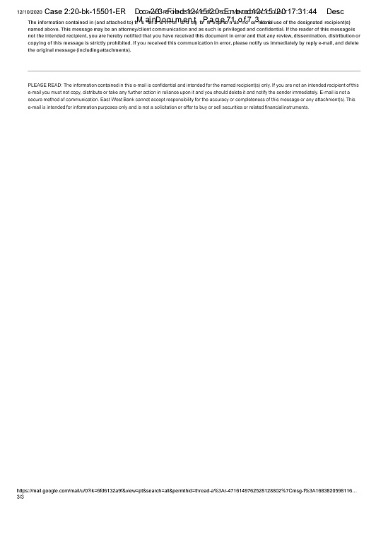 https://mail.google.com/mail/u/0?ik=6fd6132a9f&view=pt&search=all&permthid=thread - a%3Ar - 4716149762528128802%7Cmsg - f%3A1683820598 116… 3/3 PLEASE READ: The information contained in this e - mail is confidential and intended for the named recipient(s) only. If you are not an intended recipient of this e - mail you must not copy, distribute or take any further action in reliance upon it and you should delete it and notify the sender immediately. E - mail is not a secure method of communication. East West Bank cannot accept responsibility for the accuracy or completeness of this message or any attachment(s). This e - mail is intended for information purposes only and is not a solicitation or offer to buy or sell securities or related financial instruments. 12/10/2020 Case 2:20 - bk - 15501 - ER Doc Gm 2 a 6 il 3 - RE: F C i H le IN d ES 1 E 2 IN / V 1 E 5 S / T 2 O 0 RS.C E O n M t , e IN r C e . d DI 1 P 2 A / C 1 C 5 O / U 2 N 0 T 17:31:44 Desc The information contained in (and attached to) th M is a e - i m n ai D l is o in c t u en m de e d n on t ly for P th a e g pe e rso 7 n 1 al a o n f d 7 co 3 nfidential use of the designated recipient(s) named above. This message may be an attorney/client communication and as such is privileged and confidential. If the reader o f t his message is not the intended recipient, you are hereby notified that you have received this document in error and that any review, dissemination, distribution or copying of this message is strictly prohibited. If you received this communication in error, please notify us immediately by reply e - mail, and delete the original message (including attachments).