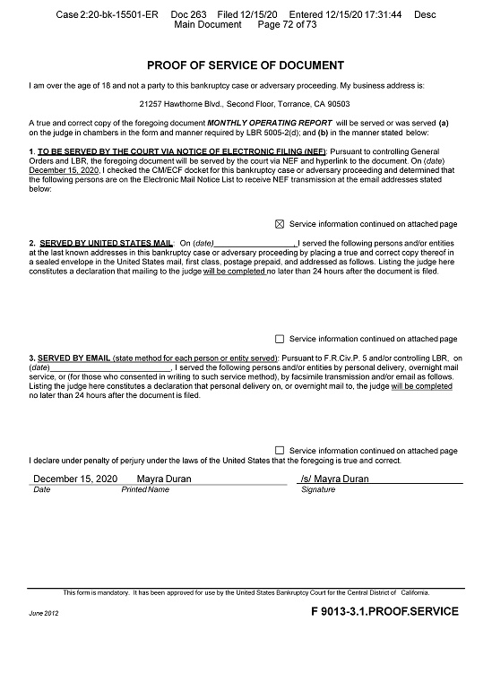 This form is mandatory. It has been approved for use by the United States Bankruptcy Court for the Central District of California. June 2012 F 9013 - 3.1.PROOF.SERVICE Service information continued on attached page 2. SERVED BY UNITED STATES MAIL : On ( date) , I served the following persons and/or entities at the last known addresses in this bankruptcy case or adversary proceeding by placing a true and correct copy thereof in a sealed envelope in the United States mail, first class, postage prepaid, and addressed as follows. Listing the judge here constitutes a declaration that mailing to the judge will be completed no later than 24 hours after the document is filed. Service information continued on attached page 3. SERVED BY EMAIL (state method for each person or entity served) : Pursuant to F.R.Civ.P. 5 and/or controlling LBR, on ( date ) , I served the following persons and/or entities by personal delivery, overnight mail service, or (for those who consented in writing to such service method), by facsimile transmission and/or email as follows. Listing the judge here constitutes a declaration that personal delivery on, or overnight mail to, the judge will be completed no later than 24 hours after the document is filed. Service information continued on attached page I declare under penalty of perjury under the laws of the United States that the foregoing is true and correct. December 15, 2020 Mayra Duran Date Printed Name /s/ Mayra Duran Signature Case 2:20 - bk - 15501 - ER Doc 263 Filed 12/15/20 Entered 12/15/20 17:31:44 Desc Main Document Page 72 of 73 PROOF OF SERVICE OF DOCUMENT I am over the age of 18 and not a party to this bankruptcy case or adversary proceeding. My business address is: 21257 Hawthorne Blvd., Second Floor, Torrance, CA 90503 A true and correct copy of the foregoing document MONTHLY OPERATING REPORT will be served or was served (a) on the judge in chambers in the form and manner required by LBR 5005 - 2(d); and (b) in the manner stated below: 1 . TO BE SERVED BY THE COURT VIA NOTICE OF ELECTRONIC FILING (NEF) : Pursuant to controlling General Orders and LBR, the foregoing document will be served by the court via NEF and hyperlink to the document. On ( date ) December 15, 2020 , I checked the CM/ECF docket for this bankruptcy case or adversary proceeding and determined that the following persons are on the Electronic Mail Notice List to receive NEF transmission at the email addresses stated below: