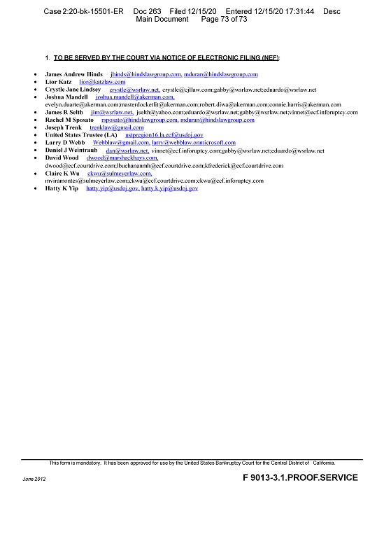 This form is mandatory. It has been approved for use by the United States Bankruptcy Court for the Central District of California. June 2012 F 9013 - 3.1.PROOF.SERVICE 1 . TO BE SERVED BY THE COURT VIA NOTICE OF ELECTRONIC FILING (NEF) : crystle@wsrlaw.net, crystle@cjllaw.com;gabby@wsrlaw.net;eduardo@wsrlaw.net James Andrew Hinds jhinds@hindslawgroup.com, mduran@hindslawgroup.com Lior Katz lior@katzlaw.com Crystle Jane Lindsey Joshua Mandell joshua.mandell@akerman.com, evelyn.duarte@akerman.com;masterdocketlit@akerman.com;robert.diwa@akerman.com;connie.harris@akerman.com dan@wsrlaw.net, vinnet@ecf.inforuptcy.com;gabby@wsrlaw.net;eduardo@wsrlaw.net James R Selth jim@wsrlaw.net, jselth@yahoo.com;eduardo@wsrlaw.net;gabby@wsrlaw.net;vinnet@ecf.inforuptcy.com Rachel M Sposato rsposato@hindslawgroup.com, mduran@hindslawgroup.com Joseph Trenk trenklaw@gmail.com United States Trustee (LA) ustpregion16.la.ecf@usdoj.gov Larry D Webb Webblaw@gmail.com, larry@webblaw.onmicrosoft.com Daniel J Weintraub David Wood dwood@marshackhays.com, dwood@ecf.courtdrive.com;lbuchananmh@ecf.courtdrive.com;kfrederick@ecf.courtdrive.com Claire K Wu ckwu@sulmeyerlaw.com, mviramontes@sulmeyerlaw.com;ckwu@ecf.courtdrive.com;ckwu@ecf.inforuptcy.com Hatty K Yip hatty.yip@usdoj.gov, hatty.k.yip@usdoj.gov Case 2:20 - bk - 15501 - ER Doc 263 Filed 12/15/20 Entere d 12/15/2 0 17:31:4 4 Desc Main Document Page 73 of 73
