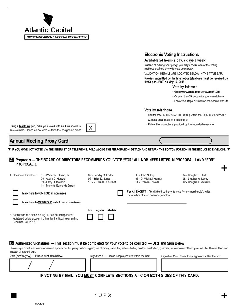Important Notice Regarding the Availability of Proxy Materials for the Annual Meeting to be held on May 18, 2016: the Proxy Statement and the Company’s Annual Report to Shareholders are available at www.edocumentview.com/ACBI.