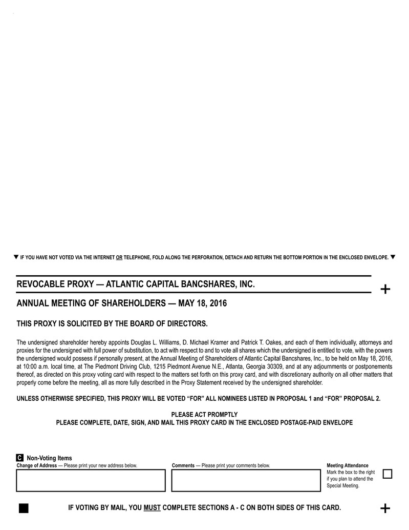 We are pleased to invite you to attend the 2016 Annual Meeting of Shareholders (the “Annual Meeting”) of Atlantic Capital Bancshares, Inc. (the “Company”). The Annual Meeting will be held at The Piedmont Driving Club, 1215 Piedmont Avenue NE, Atlanta, Georgia 30309 on Wednesday, May 18, 2016 at 10:00 a.m., local time.