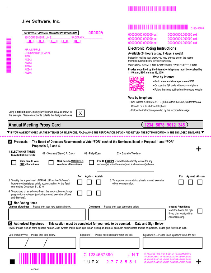 • | by Internet at http://www.envisionreports.com/JIVE 24 hours a day, seven days a week, until 11:59 p.m. EDT on May 19, 2016 (have your proxy card in hand when you visit the website); we encourage you to vote this way as it is the most cost-effective method; |