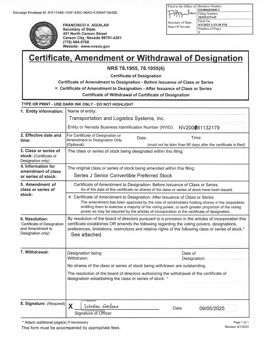 The undersigned, Sebastian Giordano, Chief Executive Officer of Transportation and Logistics Systems, Inc., (the “Corporation”), pursuant to the provisions of the Nevada Revised Statutes of the State of Nevada, does hereby certify and set forth as follows: