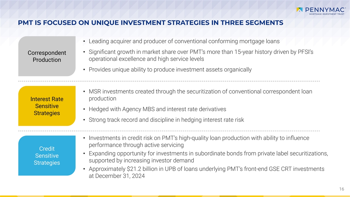 PMT’S 2024 PERFORMANCE ESTABLISHES STRONG FOUNDATION FOR 2025 Diverse strategies provided multiple Hedging strategy protected book value sources of returns despite significant interest rate volatility Pretax income contribution by strategy: 4.70% 4.57% Credit Interest rate Correspondent sensitive sensitive production 3.88% 3.62% $123mm $16mm $57mm 10-Year Treasury Yield Book Value per Share Strengthened and repositioned Expanding on our proven track balance sheet for higher rates record of organic credit investments ● Sold $833 million of low coupon MBS and $111 ● Completed two securitizations of Agency-eligible million of opportunistic investments in GSE CRT as investor loans from PMT production credit spreads tightened ‒ Generated $52 million of net new credit investments ● New MSR investments of $219 million with attractive expected returns ● Issued $1.3 billion of term debt to address and ‒ Strong investor demand and significant opportunity to leverage PMT’s production and securitization extend maturities, generally at tighter financing expertise spreads 4