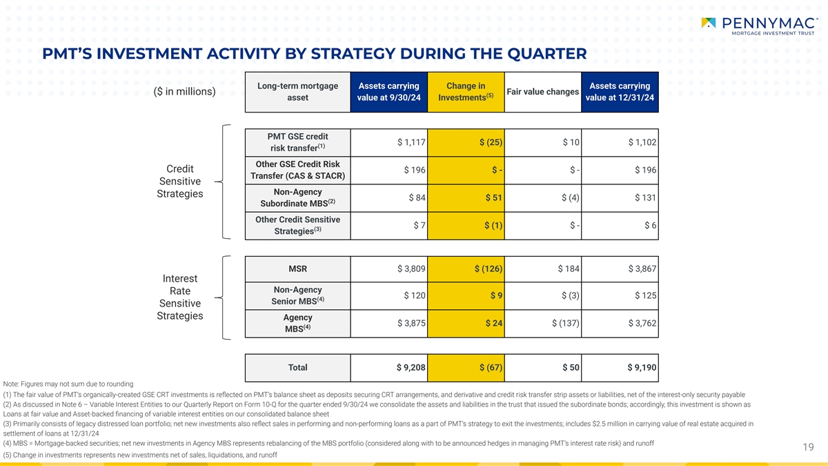 FOURTH QUARTER RESULTS AND RETURN CONTRIBUTIONS BY STRATEGY Income Excluding Total Income Market-Driven WA Equity Annualized Return ($ in millions, except EPS) Market-Driven Value (1) (2) (3) (1) Contribution Value Changes Allocated on Equity (ROE) (1)(2) Changes Credit sensitive strategies: PMT GSE credit risk transfer $ 20.1 $ 10.2 $ 9.9 $ 307 26% Other GSE Credit Risk Transfer (CAS & STACR) 4.0 0.2 3.8 98 16% PMT Non-Agency Subordinate MBS (3.3) (3.8) 0.5 24 -56% (4) Other credit sensitive strategies (0.6) 0.0 (0.6) 6 -40% Net credit sensitive strategies $ 20.1 $ 6.6 $ 13.5 $ 435 18% Interest rate sensitive strategies: MSRs (incl. recapture) $ 210.4 $ 183.9 $ 26.5 Agency MBS (incl. IO Securitization) (131.1) (136.6) 5.6 Non-Agency Senior MBS (2.7) (3.4) 0.8 Interest rate hedges (51.2) (51.2) Net interest rate sensitive strategies $ 25.5 $ (7.4) $ 32.8 $ 1,100 9% Correspondent production $ 22.5 $ 0.0 $ 22.5 $ 150 60% Cash, short term investments, and other $ 2.2 $ 2.2 $ 259 3% (5) Management fees & corporate expenses (15.2) n/a (15.2) -3% (5) Corporate $ (13.0) n/a (13.0) 259 -3% $ $ Benefit / (Provision) for income tax expense $ (8.6) (4.2) (4.4) $ $ Net income $ 46.5 $ (4.9) $ 51.5 $ 1,943 10% Dividends on preferred stock $ 10.5 $ 541 8% Net income attributable to common shareholders $ 36.1 $ 1,402 10% Diluted EPS $ 0.41 Note: Figures may not sum due to rounding (1) Income contribution and the annualized return on equity calculated net of any direct expenses associated with investments (e.g., loan fulfillment fees and loan servicing fees), but before tax expenses; some of the income associated with the investment strategies may be subject to taxation (2) Categorization of income as market-driven value changes based on management assessment; income excluding market-driven value changes does not represent REIT taxable income and is a non-GAAP figure (3) Equity allocated represents management’s internal allocation; certain financing balances and associated interest expenses are allocated between investments based on management’s assessment of target leverage ratios and required capital or liquidity to support the investment (4) Primarily consists of legacy distressed loan portfolio; net new investments also reflect sales in performing and non-performing loans as a part of PMT’s strategy to exit the investments; includes $2.5 million in carrying 12 value of real estate acquired in settlement of loans at 12/31/24 (5) ROE calculated as a percentage of total equity