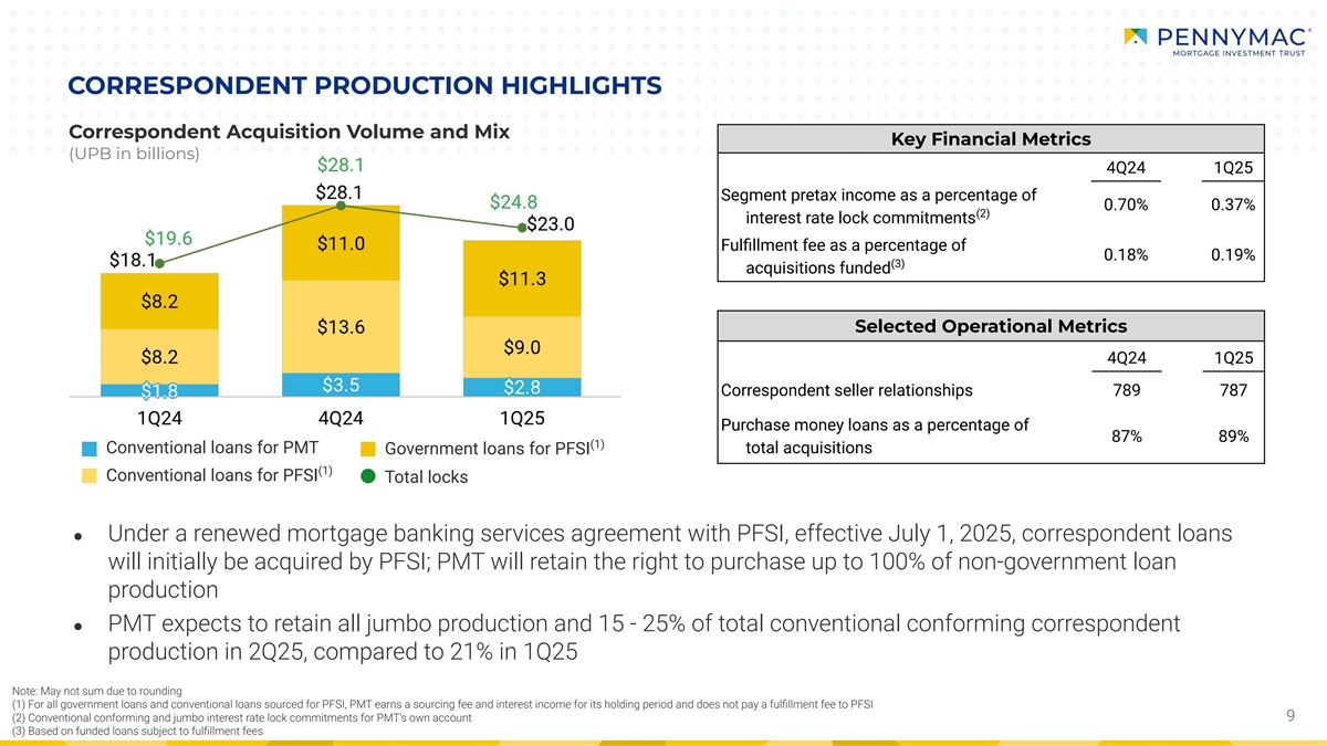 ACQUISITIONS AND LOCKS BY PRODUCT Unaudited ($ in millions) 1Q24 2Q24 3Q24 4Q24 1Q25 Correspondent Acquisitions Conventional Conforming - for PMT $ 1,769 $ 2,195 $ 5,851 $ 3,241 $ 2,437 (1) Conventional Conforming - for PFSI 8,190 10,007 8,092 13,567 8,961 (1) Government - for PFSI 8,167 10,301 11,788 11,018 11,263 Jumbo - for PMT 3 34 97 256 344 Total $ 18,128 $ 22,537 $ 25,829 $ 28,082 $ 23,005 Correspondent Locks Conventional Conforming - for PMT $ 2,472 $ 2,602 $ 7,373 $ 2,741 $ 2,210 (1) Conventional Conforming - for PFSI 8,614 9,914 8,229 13,810 9,988 (1) Government - for PFSI 8,467 11,100 12,448 11,088 12,107 Jumbo - for PMT 10 90 253 454 526 Total $ 19,563 $ 23,706 $ 28,304 $ 28,093 $ 24,831 PFSI Loans Acquired by PMT $ 0 $ 0 $ 187 $ 463 $ 637 Note: Figures may not sum due to rounding (1) PMT sells government-insured and guaranteed loans, and certain conventional loans that it purchases from correspondent sellers to PennyMac Loan Services, LLC, and earns a sourcing fee and interest income for its holding period; PMT 27 does not pay a fulfillment fee for government-insured or guaranteed loans or conventional loans subsequently sold to PFSI