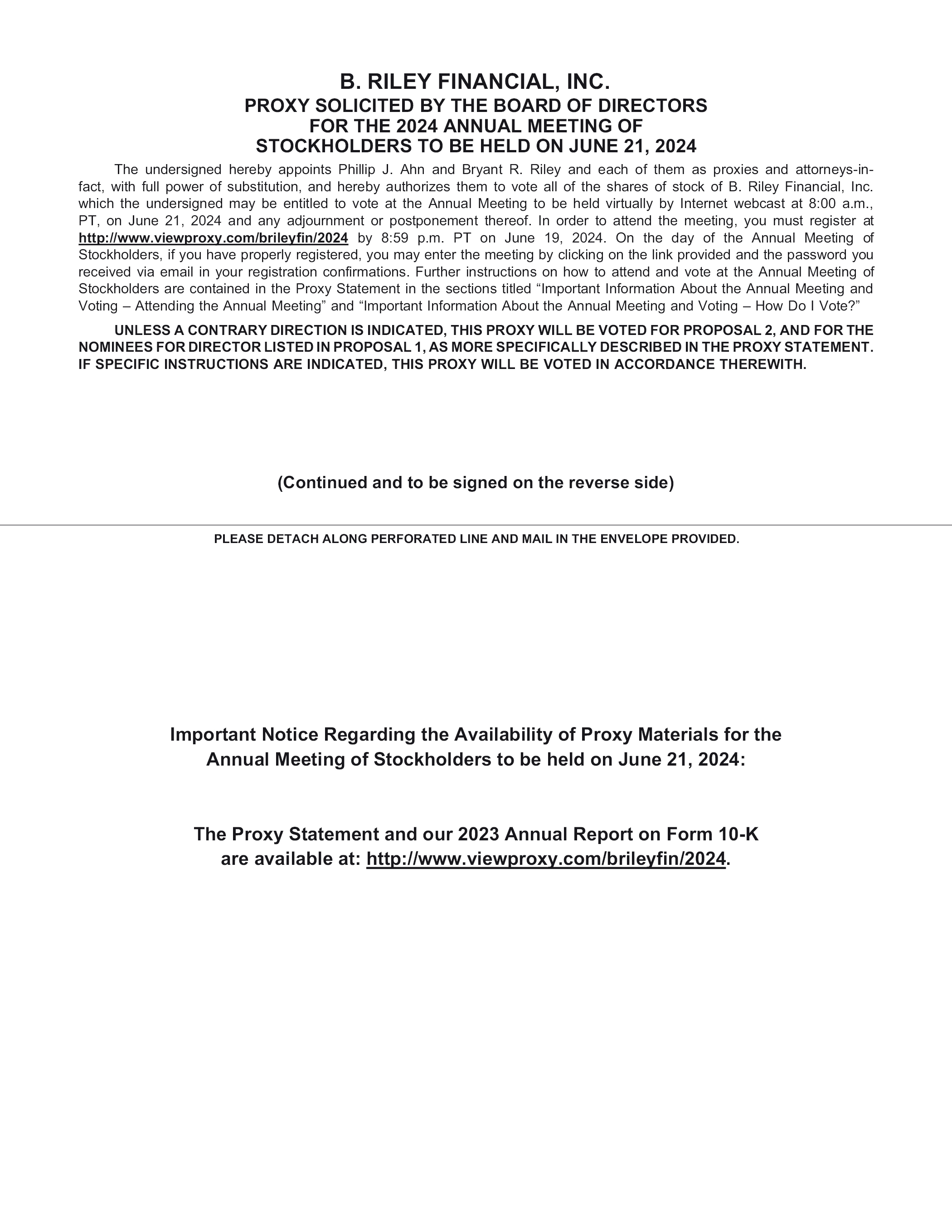 B. RILEY FINANCIAL, INC. PROXY SOLICITED BY THE BOARD OF DIRECTORS FOR THE 2024 ANNUAL MEETING OF STOCKHOLDERS TO BE HELD ON JUNE 21, 2024 The undersigned hereby appoints Phillip J. Ahn and Bryant R. Riley and each of them as proxies and attorneys-in- fact, with full power of substitution, and hereby authorizes them to vote all of the shares of stock of B. Riley Financial, Inc. which the undersigned may be entitled to vote at the Annual Meeting to be held virtually by Internet webcast at 8:00 a.m., PT, on June 21, 2024 and any adjournment or postponement thereof. In order to attend the meeting, you must register at http://www.viewproxy.com/brileyfin/2024 by 8:59 p.m. PT on June 19, 2024. On the day of the Annual Meeting of Stockholders, if you have properly registered, you may enter the meeting by clicking on the link provided and the password you received via email in your registration confirmations. Further instructions on how to attend and vote at the Annual Meeting of Stockholders are contained in the Proxy Statement in the sections titled “Important Information About the Annual Meeting and Voting – Attending the Annual Meeting” and “Important Information About the Annual Meeting and Voting – How Do I Vote?” UNLESS A CONTRARY DIRECTION IS INDICATED, THIS PROXY WILL BE VOTED FOR PROPOSAL 2, AND FOR THE NOMINEES FOR DIRECTOR LISTED IN PROPOSAL 1, AS MORE SPECIFICALLY DESCRIBED IN THE PROXY STATEMENT. IF SPECIFIC INSTRUCTIONS ARE INDICATED, THIS PROXY WILL BE VOTED IN ACCORDANCE THEREWITH. (Continued and to be signed on the reverse side) PLEASE DETACH ALONG PERFORATED LINE AND MAIL IN THE ENVELOPE PROVIDED. Important Notice Regarding the Availability of Proxy Materials for the Annual Meeting of Stockholders to be held on June 21, 2024: The Proxy Statement and our 2023 Annual Report on Form 10-K are available at: http://www.viewproxy.com/brileyfin/2024.