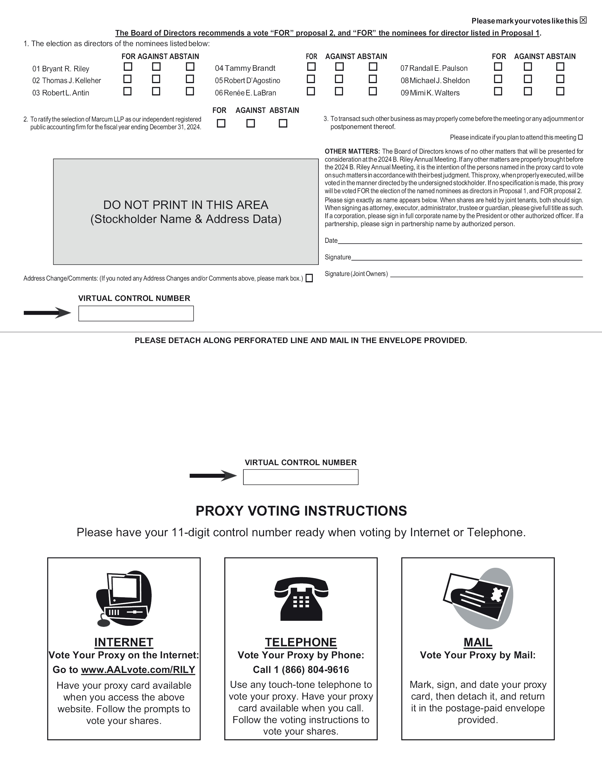 Please mark your votes like this The Board of Directors recommends a vote “FOR” proposal 2, and “FOR” the nominees for director listed in Proposal 1.1. The election as directors of the nominees listed below: FOR AGAINST ABSTAIN 01 Bryant R. Riley 02 Thomas J. Kelleher 03 Robert L. Antin 04 Tammy Brandt 05 Robert D’Agostino 06 Renée E. LaBran FOR AGAINST ABSTAIN 07 Randall E. Paulson 08 Michael J. Sheldon 09 Mimi K. Walters FOR AGAINST ABSTAIN 2. To ratify the selection of Marcum LLP as our independent registered public accounting firm for the fiscal year ending December 31, 2024. FOR AGAINST ABSTAIN3. To transact such other business as may properly come before the meeting or any adjournment or postponement thereof. Address Change/Comments: (If you noted any Address Changes and/or Comments above, please mark box.) VIRTUAL CONTROL NUMBER Please indicate if you plan to attend this meeting OTHER MATTERS: The Board of Directors knows of no other matters that will be presented for consideration at the 2024 B. Riley Annual Meeting. If any other matters are properly brought before the 2024 B. Riley Annual Meeting, it is the intention of the persons named in the proxy card to vote on such matters in accordance with their best judgment. This proxy, when properly executed, will be voted in the manner directed by the undersigned stockholder. If no specification is made, this proxy will be voted FOR the election of the named nominees as directors in Proposal 1, and FOR proposal 2. Please sign exactly as name appears below. When shares are held by joint tenants, both should sign. When signing as attorney, executor, administrator, trustee or guardian, please give full title as such. If a corporation, please sign in full corporate name by the President or other authorized officer. If a partnership, please sign in partnership name by authorized person. Date Signature Signature (Joint Owners) PLEASE DETACH ALONG PERFORATED LINE AND MAIL IN THE ENVELOPE PROVIDED. VIRTUAL CONTROL NUMBERPROXY VOTING INSTRUCTIONS Please have your 11-digit control number ready when voting by Internet or Telephone. INTERNET Vote Your Proxy on the Internet: Go to www.AALvote.com/RILY Have your proxy card available when you access the above website. Follow the prompts to vote your shares. TELEPHONE Vote Your Proxy by Phone: Call 1 (866) 804-9616 Use any touch-tone telephone to vote your proxy. Have your proxy card available when you call. Follow the voting instructions to vote your shares. TELEPHONE Vote Your Proxy by Phone: Call 1 (866) 804-9616 Use any touch-tone telephone to vote your proxy. Have your proxy card available when you call. Follow the voting instructions to vote your shares.