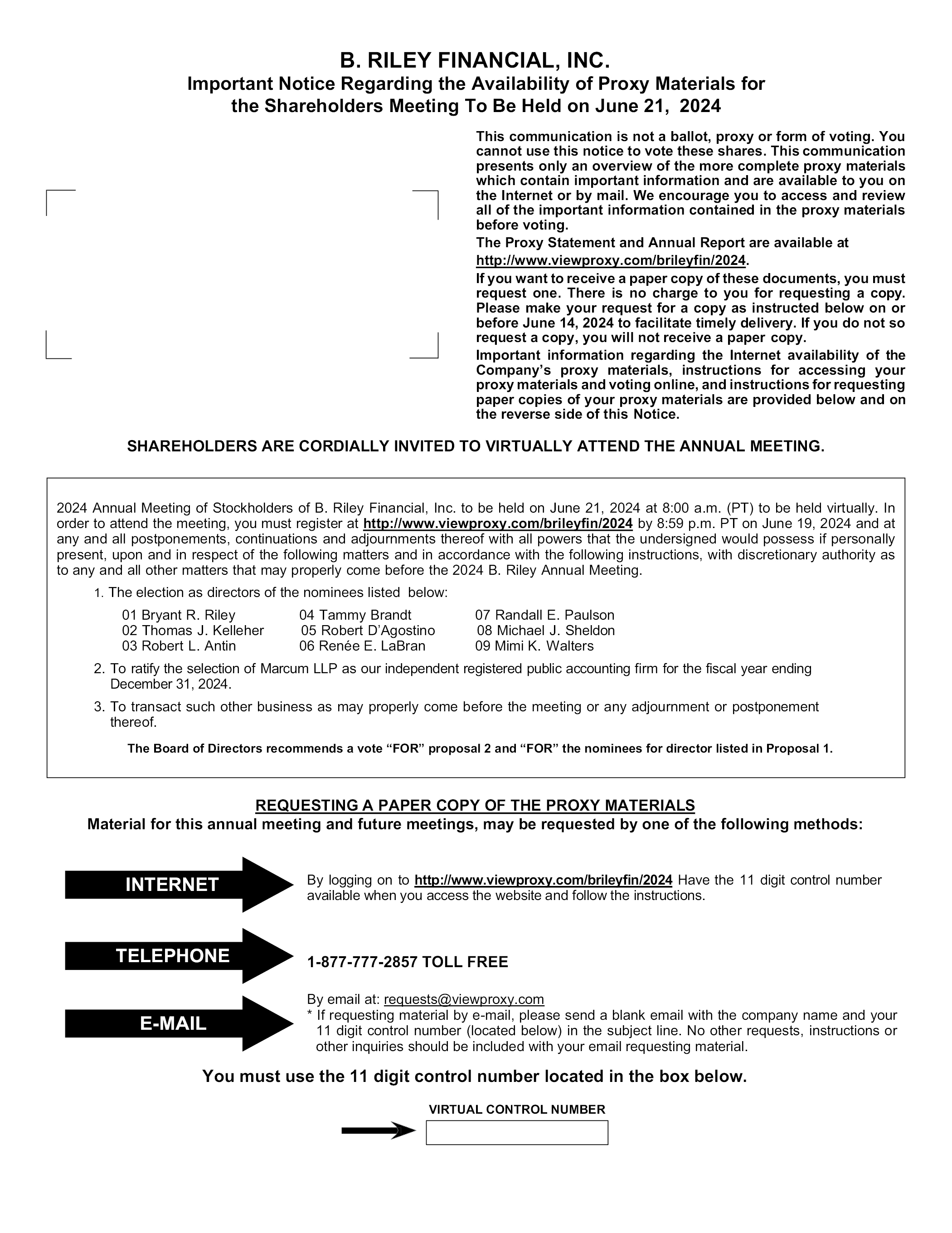 B. RILEY FINANCIAL, INC. Important Notice Regarding the Availability of Proxy Materials for the Shareholders Meeting To Be Held on June 21, 2024 This communication is not a ballot, proxy or form of voting. You cannot use this notice to vote these shares. This communication presents only an overview of the more complete proxy materials which contain important information and are available to you on the Internet or by mail. We encourage you to access and review all of the important information contained in the proxy materials before voting. The Proxy Statement and Annual Report are available at http://www.viewproxy.com/brileyfin/2024. If you want to receive a paper copy of these documents, you must request one. There is no charge to you for requesting a copy. Please make your request for a copy as instructed below on or before June 14, 2024 to facilitate timely delivery. If you do not so request a copy, you will not receive a paper copy. Important information regarding the Internet availability of the Company’s proxy materials, instructions for accessing your proxy materials and voting online, and instructions for requesting paper copies of your proxy materials are provided below and on the reverse side of this Notice. SHAREHOLDERS ARE CORDIALLY INVITED TO VIRTUALLY ATTEND THE ANNUAL MEETING. 2024 Annual Meeting of Stockholders of B. Riley Financial, Inc. to be held on June 21, 2024 at 8:00 a.m. (PT) to be held virtually. In order to attend the meeting, you must register at http://www.viewproxy.com/brileyfin/2024 by 8:59 p.m. PT on June 19, 2024 and at any and all postponements, continuations and adjournments thereof with all powers that the undersigned would possess if personally present, upon and in respect of the following matters and in accordance with the following instructions, with discretionary authority as to any and all other matters that may properly come before the 2024 B. Riley Annual Meeting. 1. The election as directors of the nominees listed below: 01 Bryant R. Riley 04 Tammy Brandt 07 Randall E. Paulson 02 Thomas J. Kelleher 05 Robert D’Agostino 08 Michael J. Sheldon 03 Robert L. Antin 06 Renée E. LaBran 09 Mimi K. Walters 2. To ratify the selection of Marcum LLP as our independent registered public accounting firm for the fiscal year ending December 31, 2024. 3. To transact such other business as may properly come before the meeting or any adjournment or postponement thereof. The Board of Directors recommends a vote “FOR” proposal 2 and “FOR” the nominees for director listed in Proposal 1. REQUESTING A PAPER COPY OF THE PROXY MATERIALS Material for this annual meeting and future meetings, may be requested by one of the following methods: INTERNET TELEPHONE E-MAIL By logging on to http://www.viewproxy.com/brileyfin/2024 Have the 11 digit control number available when you access the website and follow the instructions. 1-877-777-2857 TOLL FREE By email at: requests@viewproxy.com * If requesting material by e-mail, please send a blank email with the company name and your 11 digit control number (located below) in the subject line. No other requests, instructions or other inquiries should be included with your email requesting material. You must use the 11 digit control number located in the box below. VIRTUAL CONTROL NUMBER