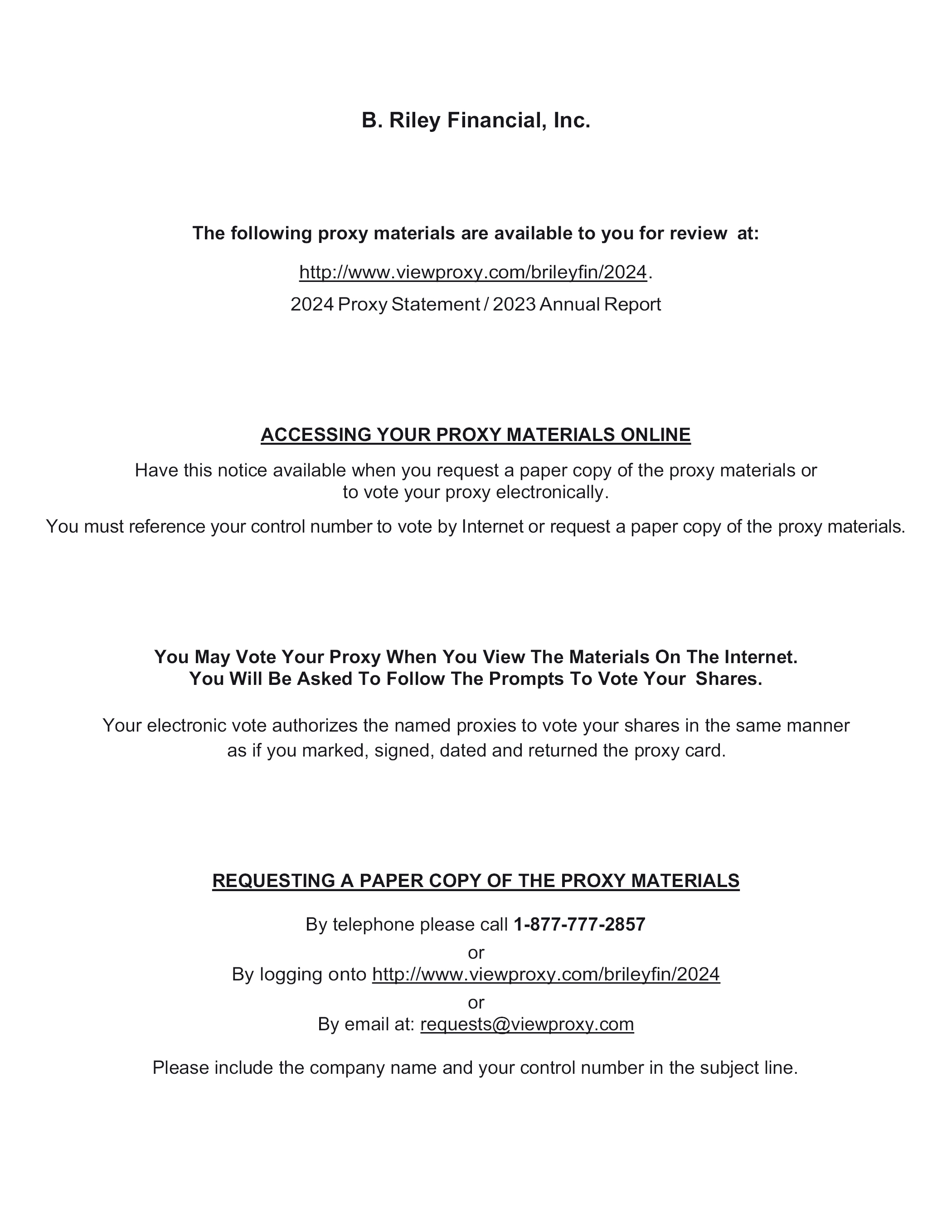 B. Riley Financial, Inc. The following proxy materials are available to you for review at: http://www.viewproxy.com/brileyfin/2024. 2024 Proxy Statement / 2023 Annual Report ACCESSING YOUR PROXY MATERIALS ONLINE Have this notice available when you request a paper copy of the proxy materials or to vote your proxy electronically. You must reference your control number to vote by Internet or request a paper copy of the proxy materials. You May Vote Your Proxy When You View The Materials On The Internet. You Will Be Asked To Follow The Prompts To Vote Your Shares. Your electronic vote authorizes the named proxies to vote your shares in the same manner as if you marked, signed, dated and returned the proxy card. REQUESTING A PAPER COPY OF THE PROXY MATERIALS By telephone please call 1-877-777-2857 or By logging onto http://www.viewproxy.com/brileyfin/2024 or By email at: requests@viewproxy.com Please include the company name and your control number in the subject line.