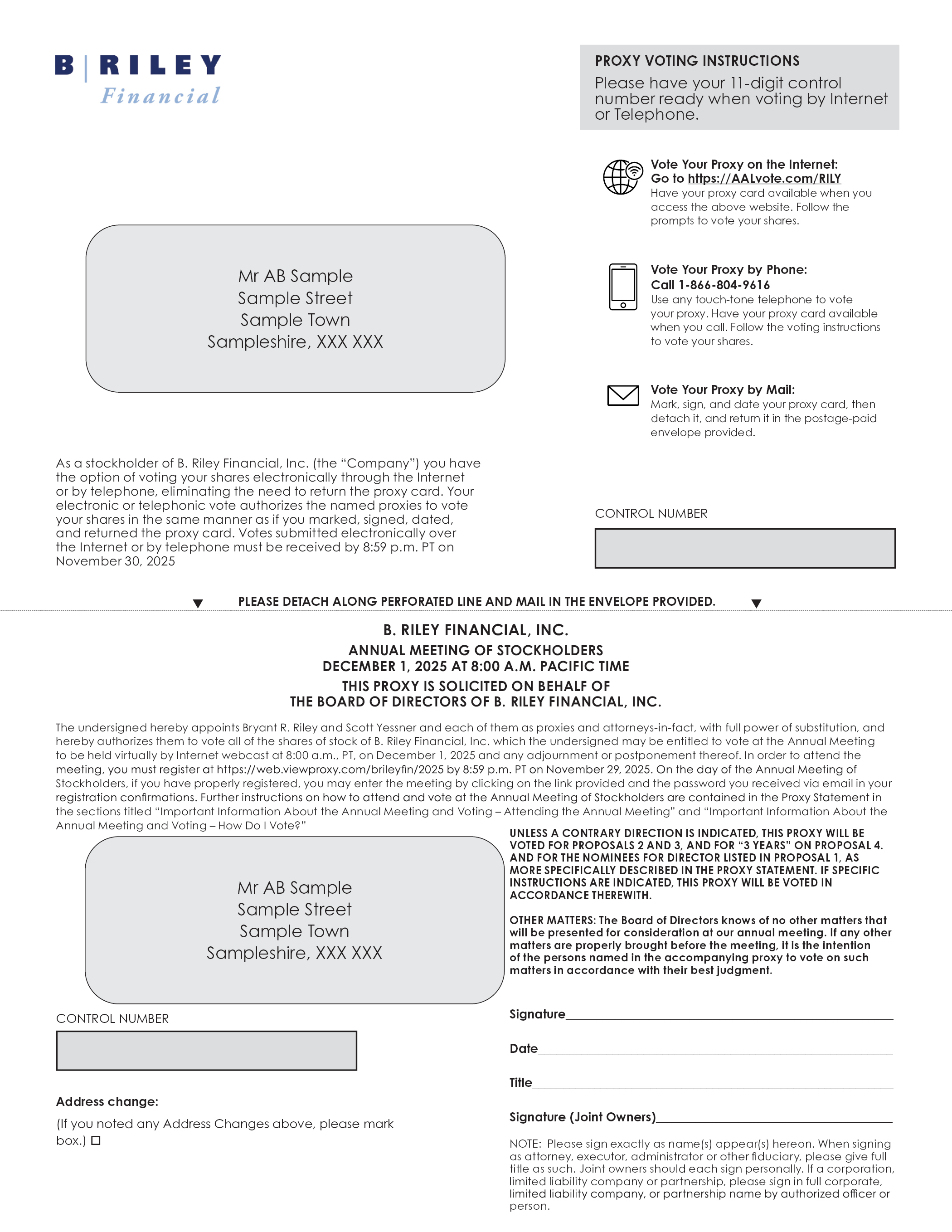 PROXY VOTING INSTRUCTIONS Please have your 11-digit control number ready when voting by Internet or Telephone. Vote Your Proxy on the Internet: Go to https://AALvote.com/RILY Have your proxy card available when you access the above website. Follow the prompts to vote your shares. Vote Your Proxy by Phone: Call 1-866-804-9616 Use any touch-tone telephone to vote your proxy. Have your proxy card available when you call. Follow the voting instructions to vote your shares. Vote Your Proxy by Mail: Mark, sign, and date your proxy card, then detach it, and return it in the postage-paid envelope provided. Mr AB Sample Sample Street Sample Town Sampleshire, XXX XXX As a stockholder of B. Riley Financial, Inc. (the “Company”) you have the option of voting your shares electronically through the Internet or by telephone, eliminating the need to return the proxy card. Your electronic or telephonic vote authorizes the named proxies to vote your shares in the same manner as if you marked, signed, dated, and returned the proxy card. Votes submitted electronically over the Internet or by telephone must be received by 8:59 p.m. PT on November 30, 2025 CONTROL NUMBER PLEASE DETACH ALONG PERFORATED LINE AND MAIL IN THE ENVELOPE PROVIDED. B. RILEY FINANCIAL, INC. ANNUAL MEETING OF STOCKHOLDERS DECEMBER 1, 2025 AT 8:00 A.M. PACIFIC TIME THIS PROXY IS SOLICITED ON BEHALF OF THE BOARD OF DIRECTORS OF B. RILEY FINANCIAL, INC. The undersigned hereby appoints Bryant R. Riley and Scott Yessner and each of them as proxies and attorneys-in-fact, with full power of substitution, and hereby authorizes them to vote all of the shares of stock of B. Riley Financial, Inc. which the undersigned may be entitled to vote at the Annual Meeting to be held virtually by Internet webcast at 8:00 a.m., PT, on December 1, 2025 and any adjournment or postponement thereof. In order to attend the meeting, you must register at https://web.viewproxy.com/brileyfin/2025 by 8:59 p.m. PT on November 29, 2025. On the day of the Annual Meeting of Stockholders, if you have properly registered, you may enter the meeting by clicking on the link provided and the password you received via email in your registration confirmations. Further instructions on how to attend and vote at the Annual Meeting of Stockholders are contained in the Proxy Statement in the sections titled “Important Information About the Annual Meeting and Voting – Attending the Annual Meeting” and “Important Information About the Annual Meeting and Voting – How Do I Vote?” UNLESS A CONTRARY DIRECTION IS INDICATED, THIS PROXY WILL BE VOTED FOR PROPOSALS 2 AND 3, AND FOR “3 YEARS” ON PROPOSAL 4. AND FOR THE NOMINEES FOR DIRECTOR LISTED IN PROPOSAL 1, AS MORE SPECIFICALLY DESCRIBED IN THE PROXY STATEMENT. IF SPECIFIC INSTRUCTIONS ARE INDICATED, THIS PROXY WILL BE VOTED IN ACCORDANCE THEREWITH. OTHER MATTERS: The Board of Directors knows of no other matters that will be presented for consideration at our annual meeting. If any other matters are properly brought before the meeting, it is the intention of the persons named in the accompanying proxy to vote on such matters in accordance with their best judgment. Mr AB Sample Sample Street Sample Town Sampleshire, XXX XXX CONTROL NUMBER Address change: (If you noted any Address Changes above, please mark box.) Signature Date Title Signature (Joint Owners) NOTE: Please sign exactly as name(s) appear(s) hereon. When signing as attorney, executor, administrator or other fiduciary, please give full title as such. Joint owners should each sign personally. If a corporation, limited liability company or partnership, please sign in full corporate, limited liability company, or partnership name by authorized officer or person.